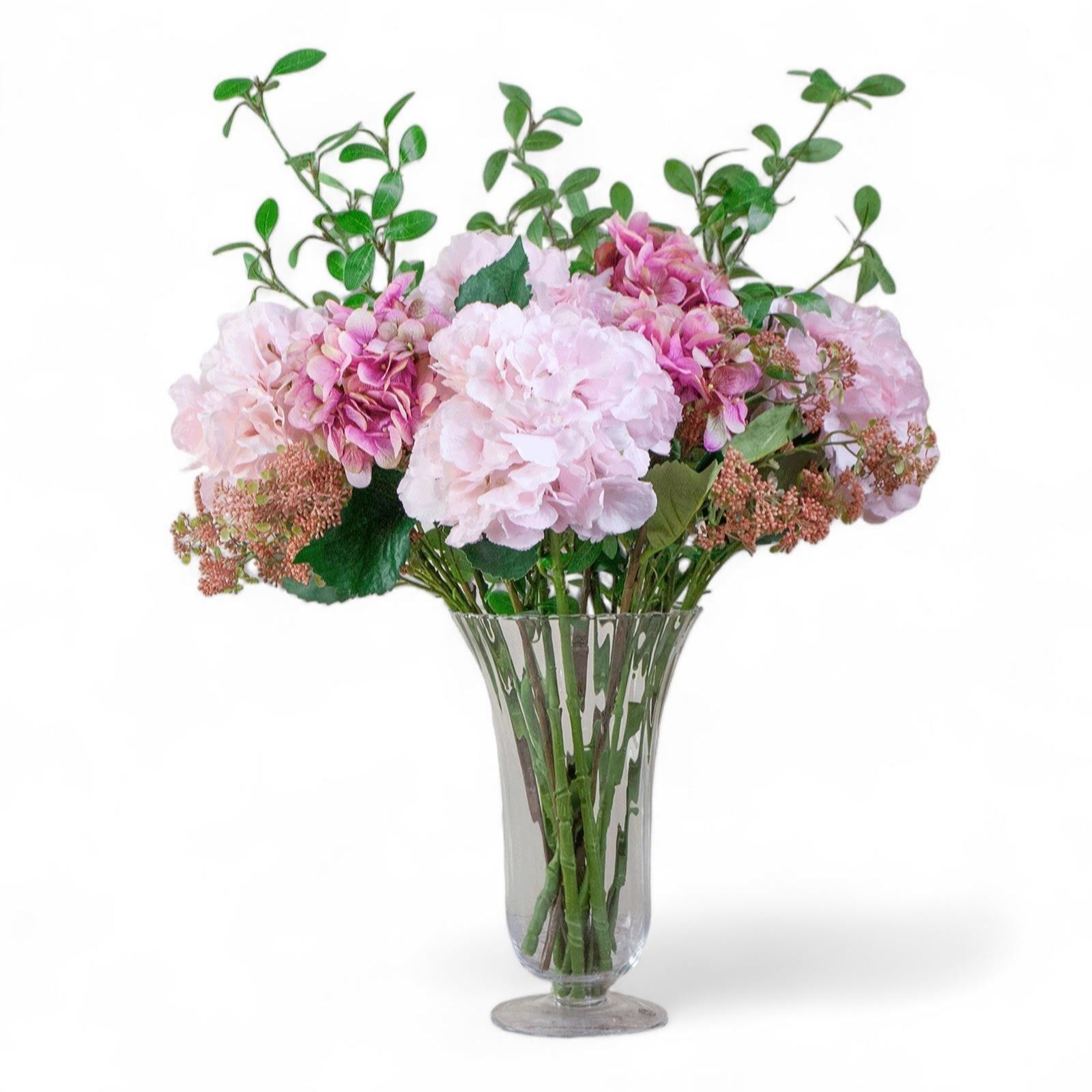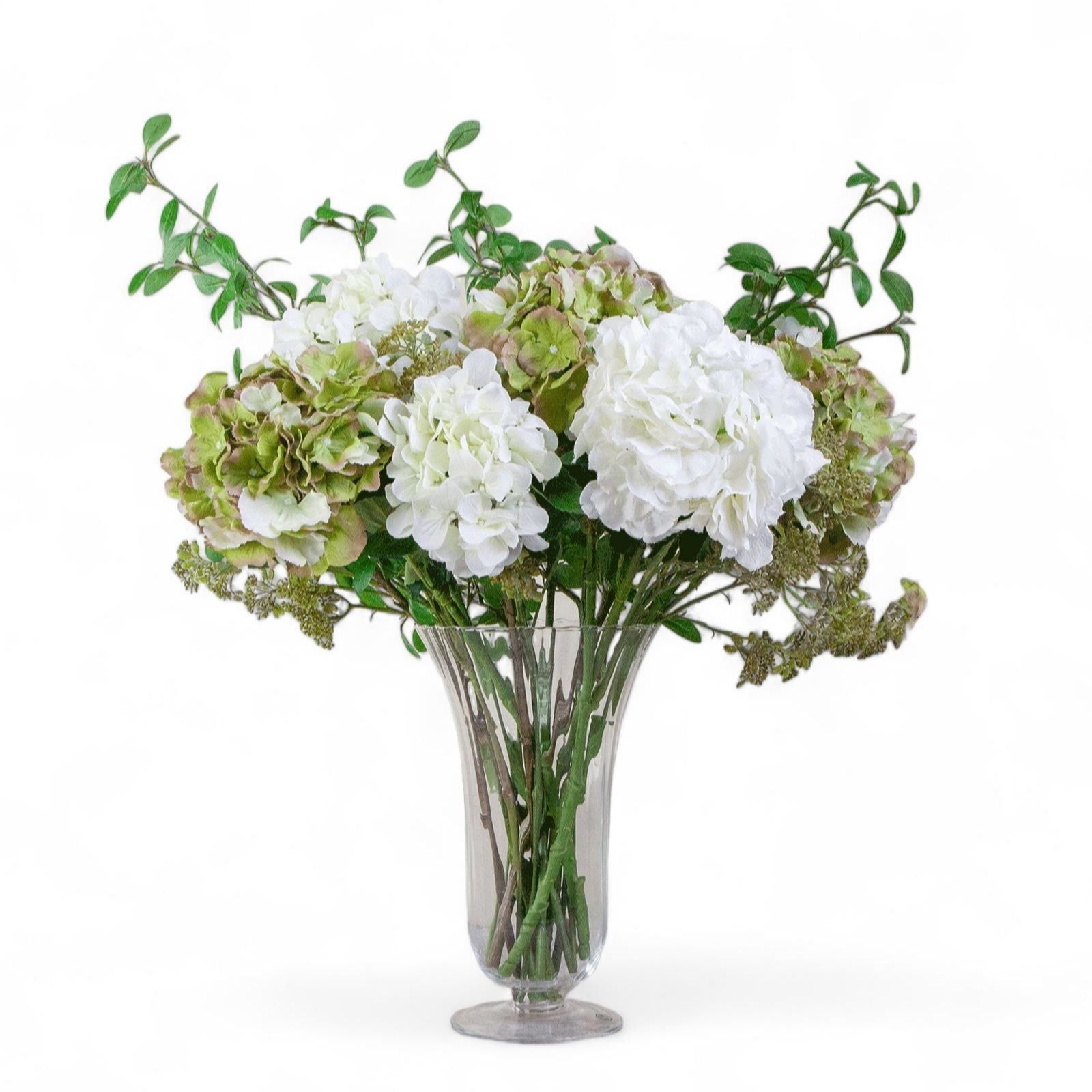 Transform your living space with the elegant Hydrangeas and Foliage in a Trumpet Vase from Peony. This stunning arrangement features lifelike hydrangeas and foliage, beautifully presented in a sophisticated trumpet vase, making it a timeless addition to your home dÂcor. Perfect for adding a touch of nature to any room, this arrangement requires no maintenance and stays fresh all year round, effortlessly enhancing your interiors charm.