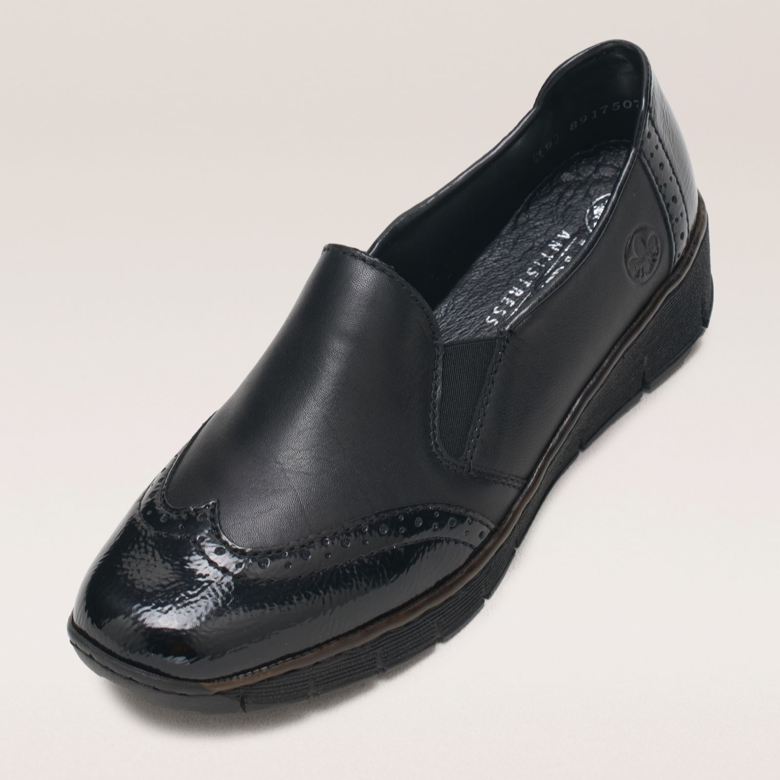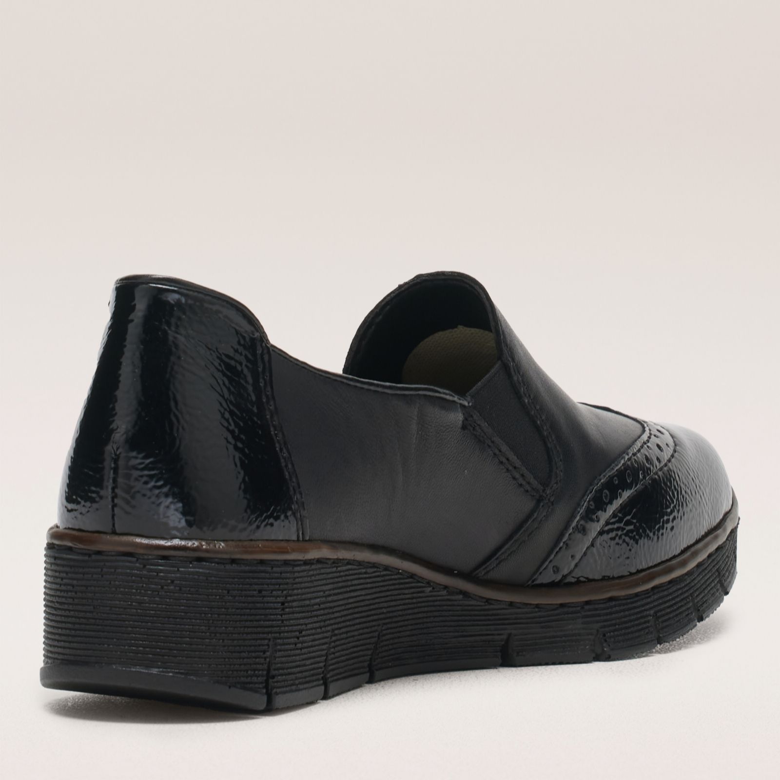 Add a touch of sophistication to your look with these patent brogue detail wedge shoes from Rieker. These lightweight slip-on loafers showcase a classic brogue toe and an elasticated design for easy wear, all while providing exceptional comfort with their cushioned footbed. Crafted from a combination of leather and synthetic materials, they're perfect for daily errands or a casual day at the office. Pair them with tailored trousers or a smart skirt for a polished look thats ready for any occasion.