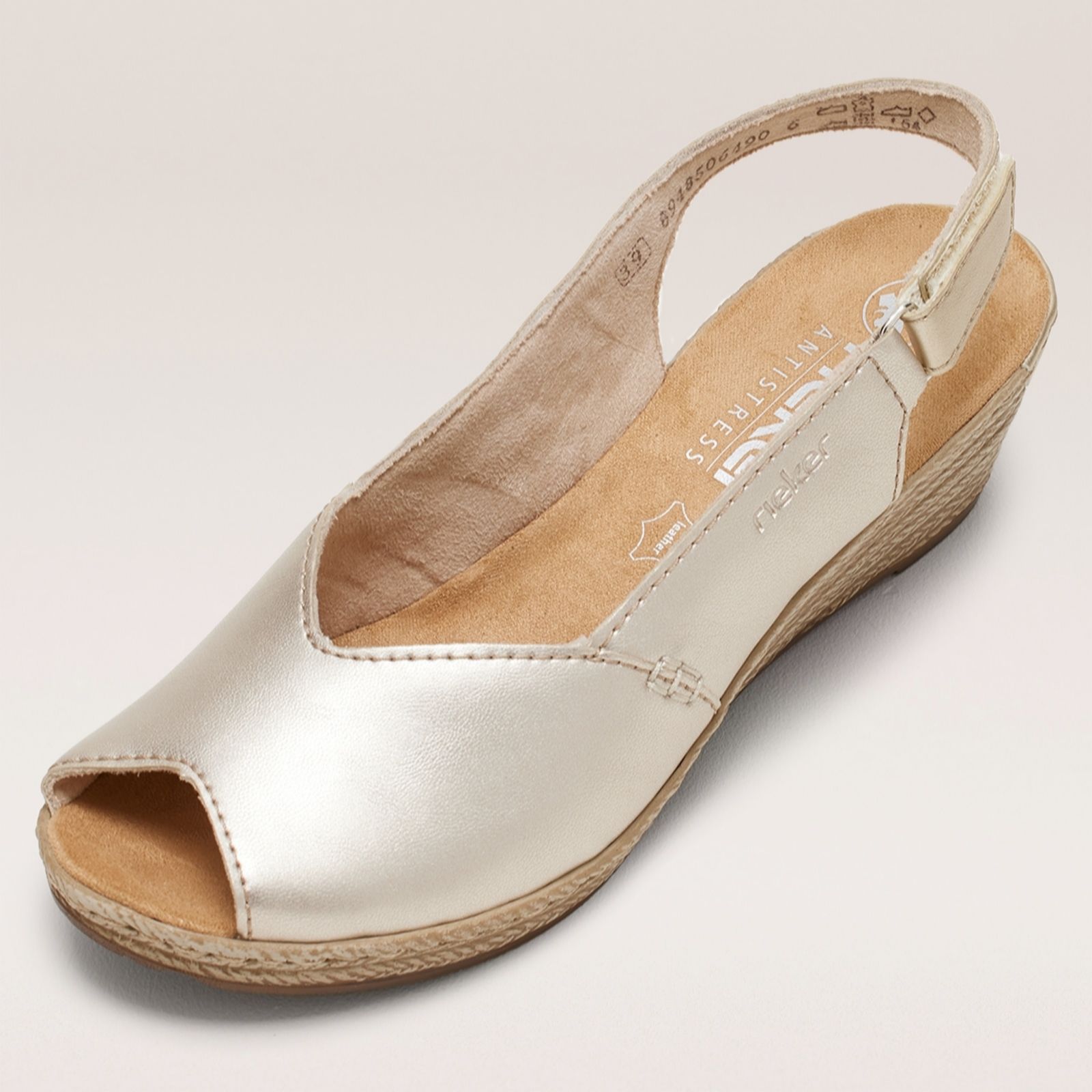 Step into effortless style and comfort with these wedge sandals from Rieker. Featuring a lightweight design, open toe, and cushioned footbed, they are perfect for all-day wear. The slingback with hook and loop adjustment ensures a secure fit, while the woven look effect adds elegance. Ideal for a summer brunch or evening stroll, these sandals elevate any outfit. Pair them with a flowy dress or cropped trousers for a chic look.