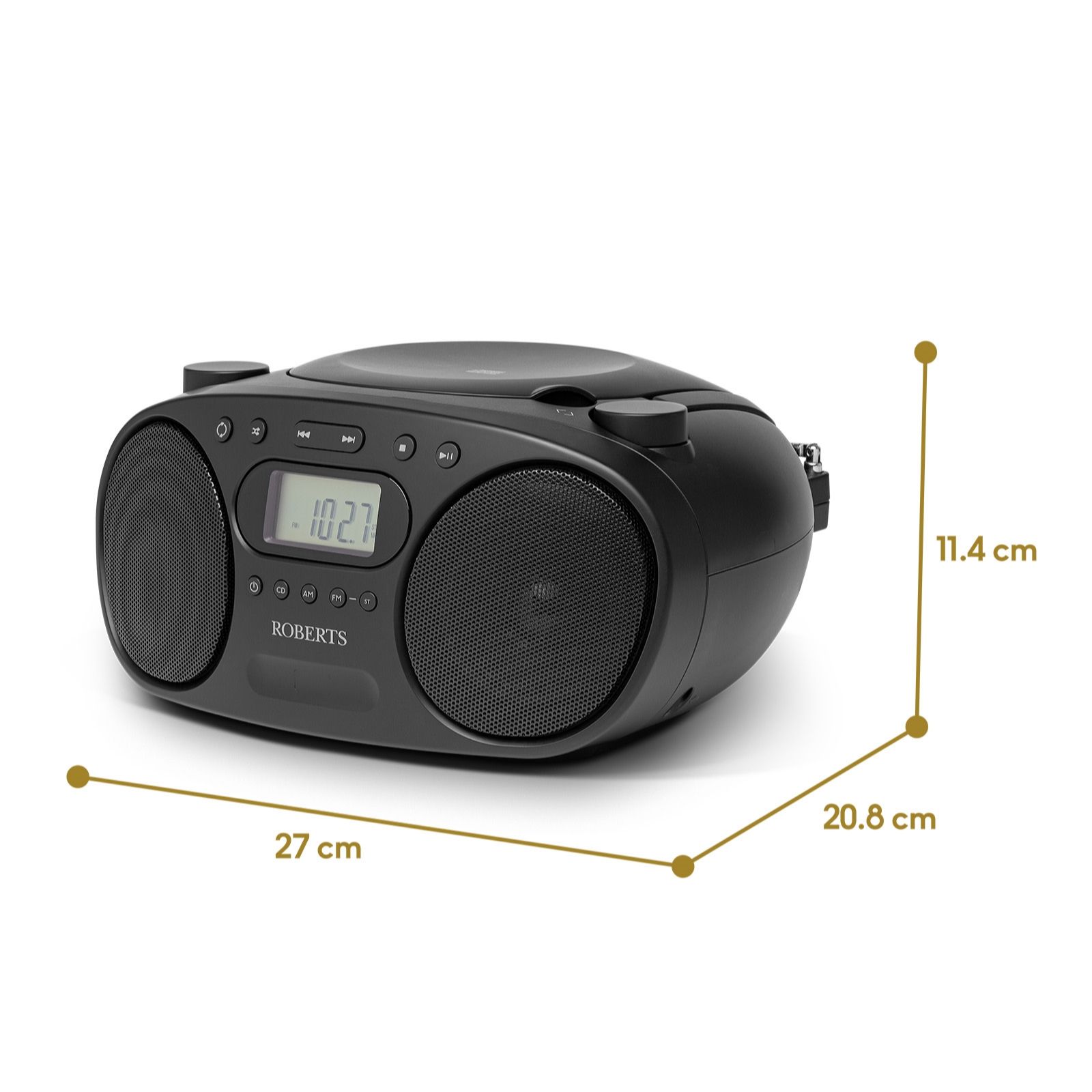 Experience the timeless charm of the Roberts Zoombox FM/AM Radio with CD Player. This sleek, portable music player combines classic functionality with modern design, featuring dual speakers for clear stereo sound, a headphone socket for private listening and an intuitive interface. Perfect for any occasion, whether you're enjoying a quiet evening at home, hosting a gathering or on the go, the Zoombox ensures you never miss a beat with its versatile playback options.