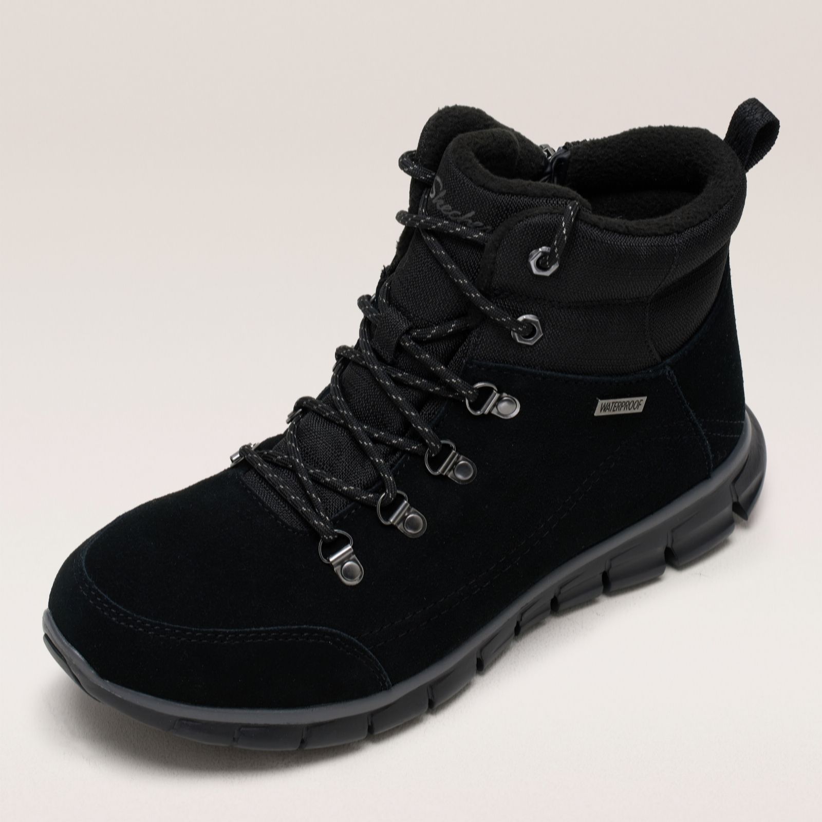 Winter-weather style meets sporty comfort with these waterproof Synergy Anti-Slip Waterproof boots from Skechers. The bootie-style shoes boast chic suede uppers with a textile trim and a seam-sealed waterproof design to help keep your feet dry. Their anti-slip traction outsoles help to prevent skids, while the shock-absorbing midsoles, memory foam soles and soft textile lining keep your feet comfy every step of the way. Perfect for winter walks in all weathers, these stylish boots are ideal for staying active throughout the chillier months.