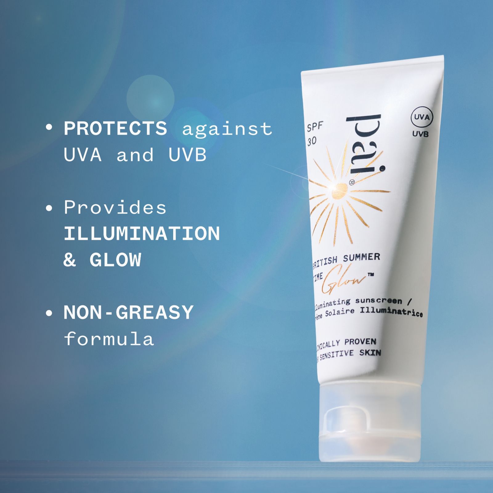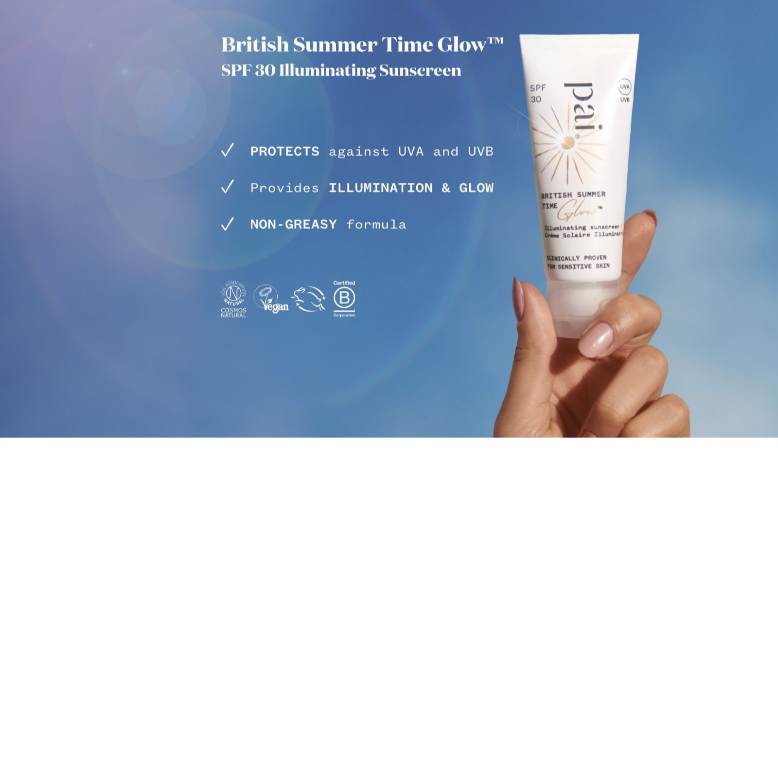 Get your glow on with the Pai British Summertime Glow SPF Everyday Duo, designed to help protect and enhance your skin's natural radiance. Featuring a lightweight mineral sunscreen that feels like skincare and a customisable glow drop formula loved by make-up artists, this duo helps create a smooth, luminous base that's perfect for everyday wear - whether you're heading out into the sunshine or simply want that fresh, dewy look indoors.