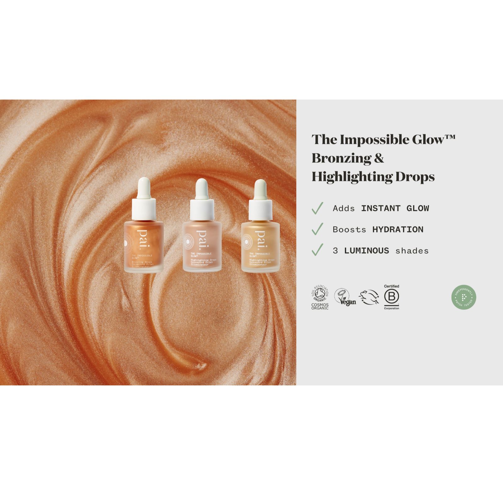 Start your day with a radiant glow using Pai's The Impossible Glow Hyaluronic Acid Glow Drops Trio. This luxurious set features three captivating shades - Bronze, Champagne and Rose Gold - designed to help enhance the look of your complexion with a luminous finish. Whether you add a drop to your daily moisturiser or use it as a highlighter, these drops are perfect for those moments when you want to add a touch of radiance to your skincare or bodycare routine.