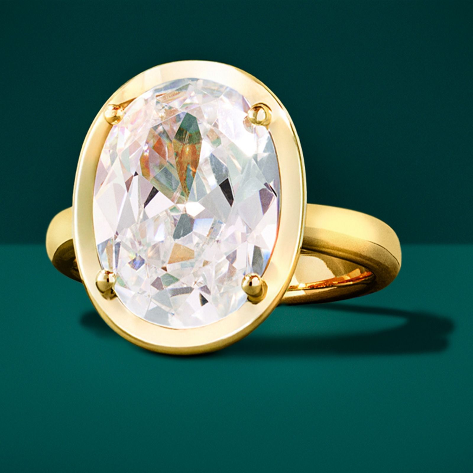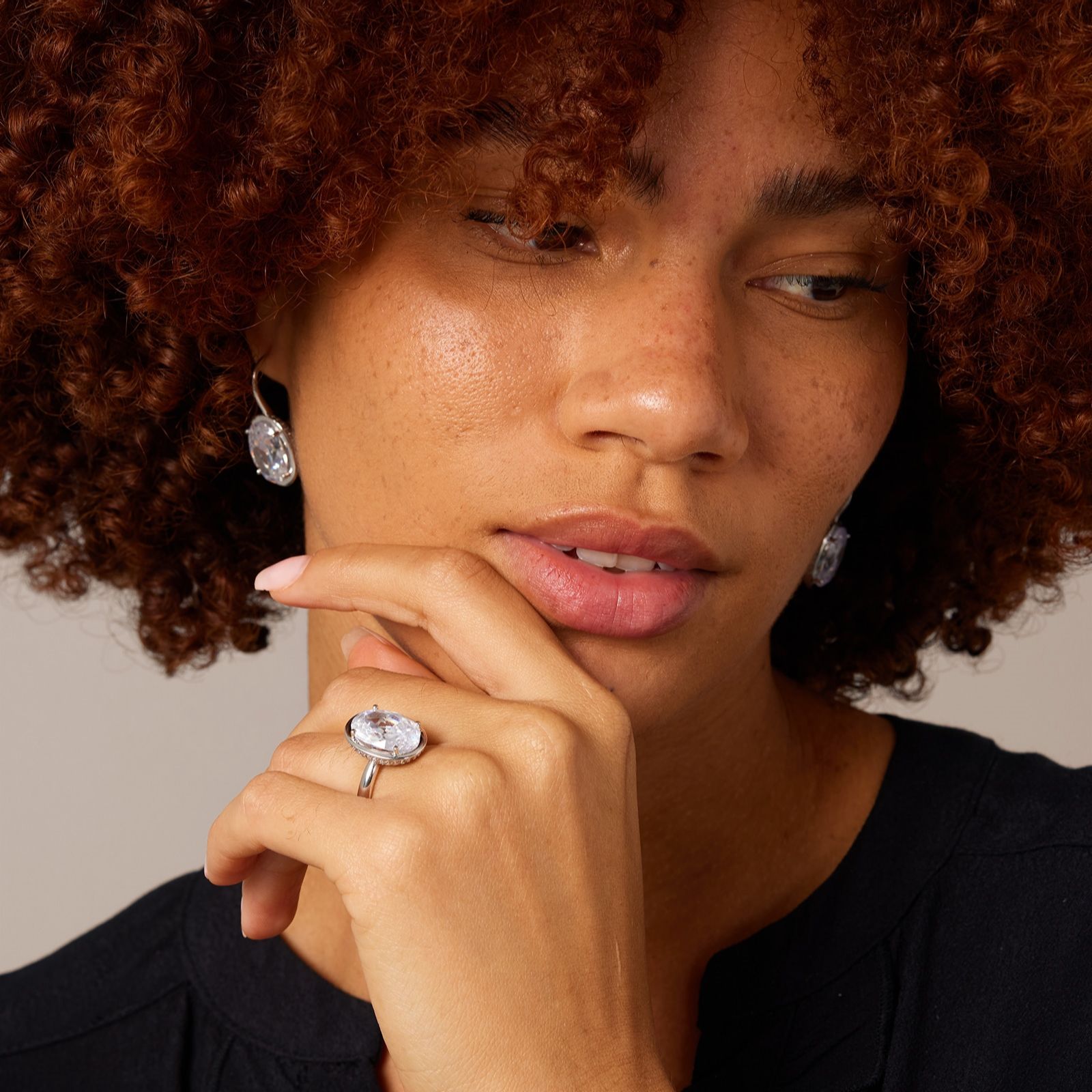 Make a statement with the Paul Costelloe for Diamonique Oval Pave Cocktail Ring. This eye-catching design showcases a large oval diamond-cut white simulated diamond, surrounded by a sparkling pave of round-cut cubic zirconia. Crafted from brass, it's a glamorous addition to any jewellery collection and perfect for special occasions.