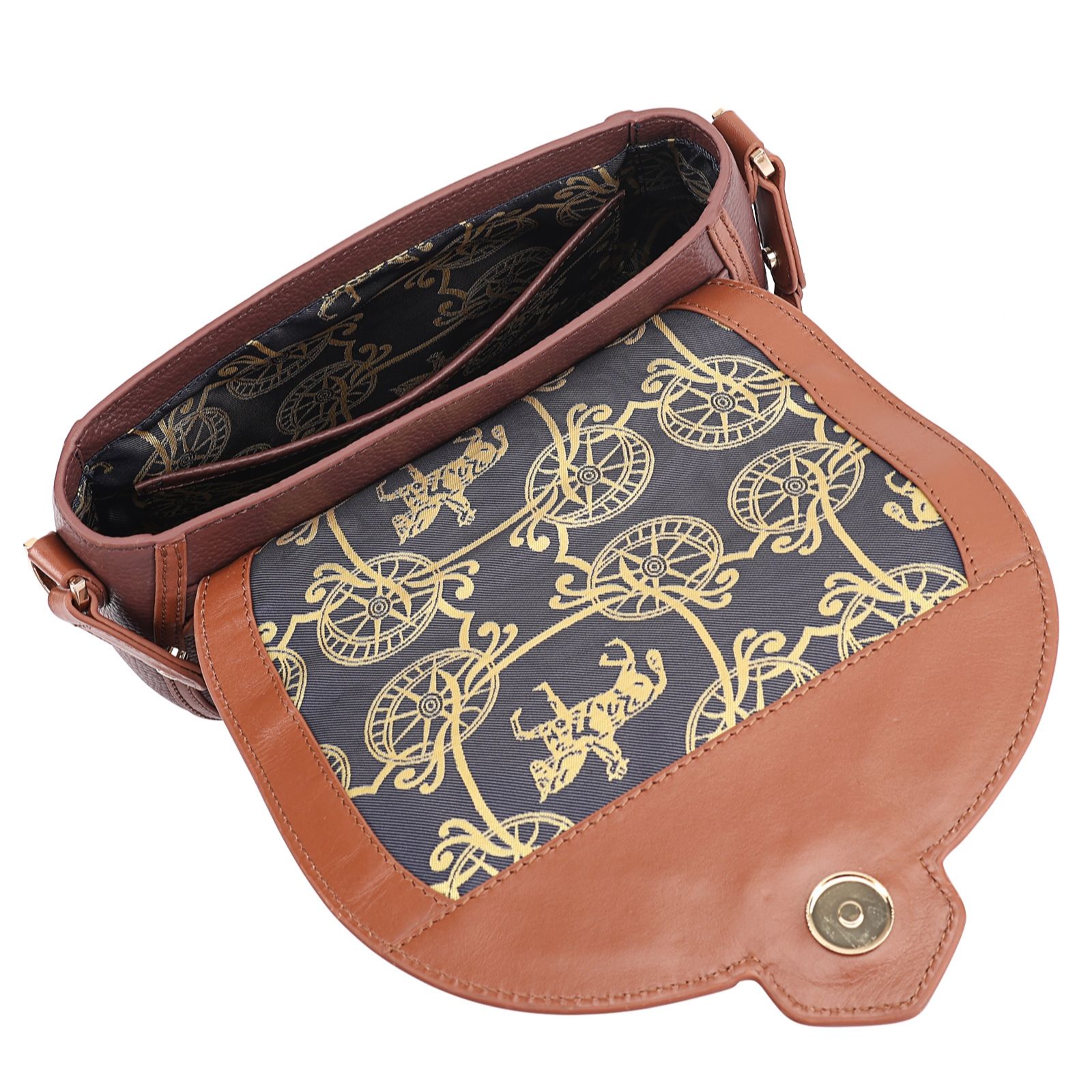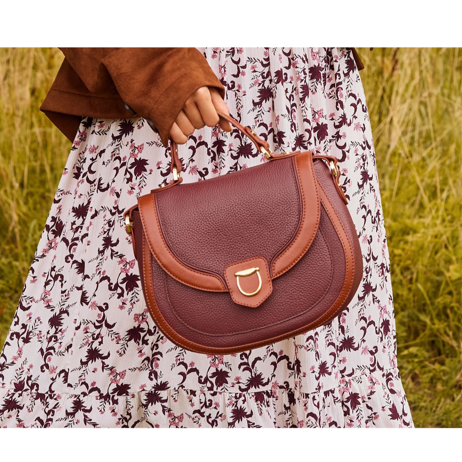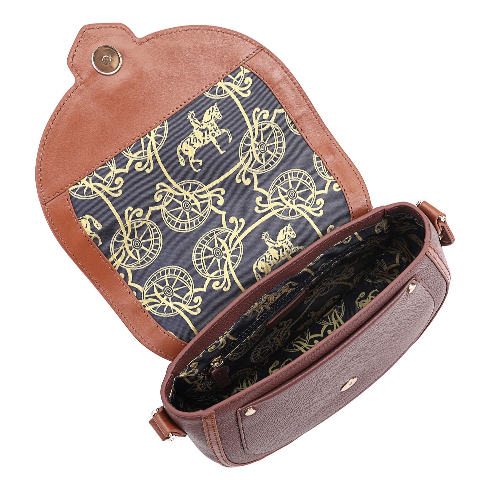 Charm wherever you venture to with the Dressage saddle cross-body bag from Paul Costelloe, designed with a sleek flap and magnetic closure, plus practical front and back pockets for clever organisation. Perfect for busy days, nature strolls or weekend escapes, its adjustable leather-woven strap brings comfort and style. Pair it with a tailored coat or long cardigan to add a refined finish to any outfit.