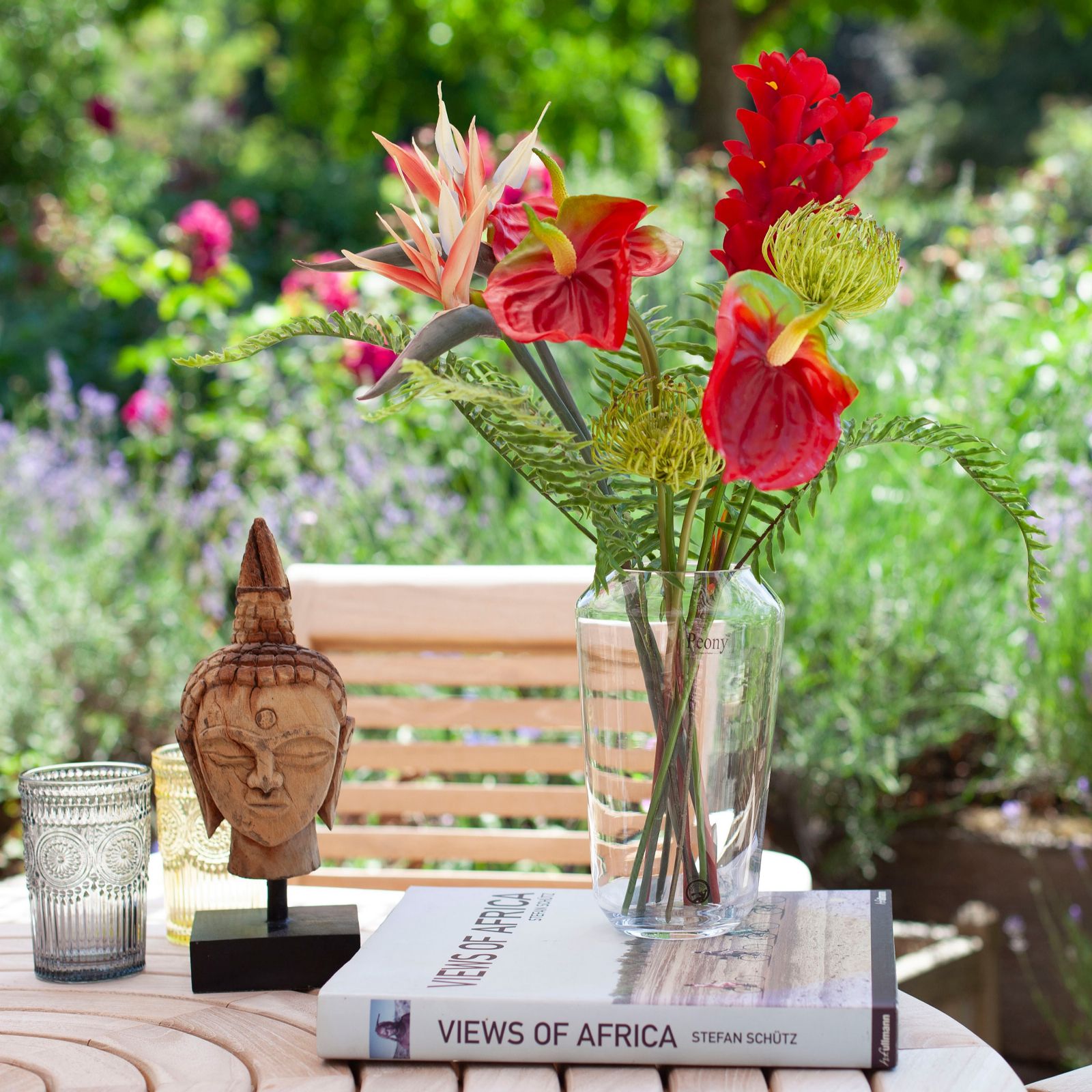 Transform your living space with the Peony Tropical Arrangement in an angled neck vase, where lush, exotic blooms are artfully arranged to bring a fresh, holiday-inspired vibe to your home. Perfect for brightening up your dining table, hallway or office, this striking arrangement instantly adds a touch of tropical elegance and lasting beauty with zero maintenance required.