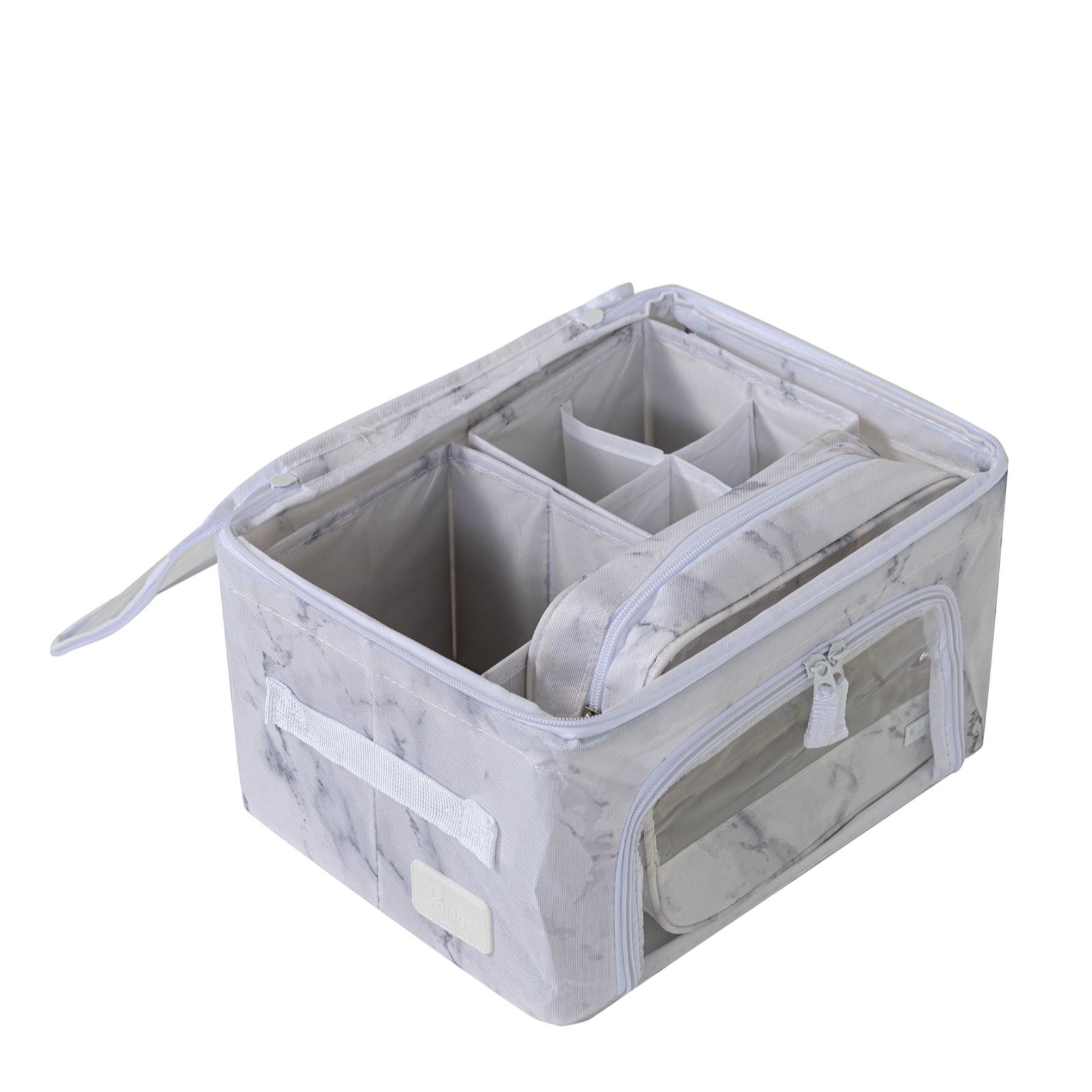 - Zip-up window panel on main box, carry handles, and hard base