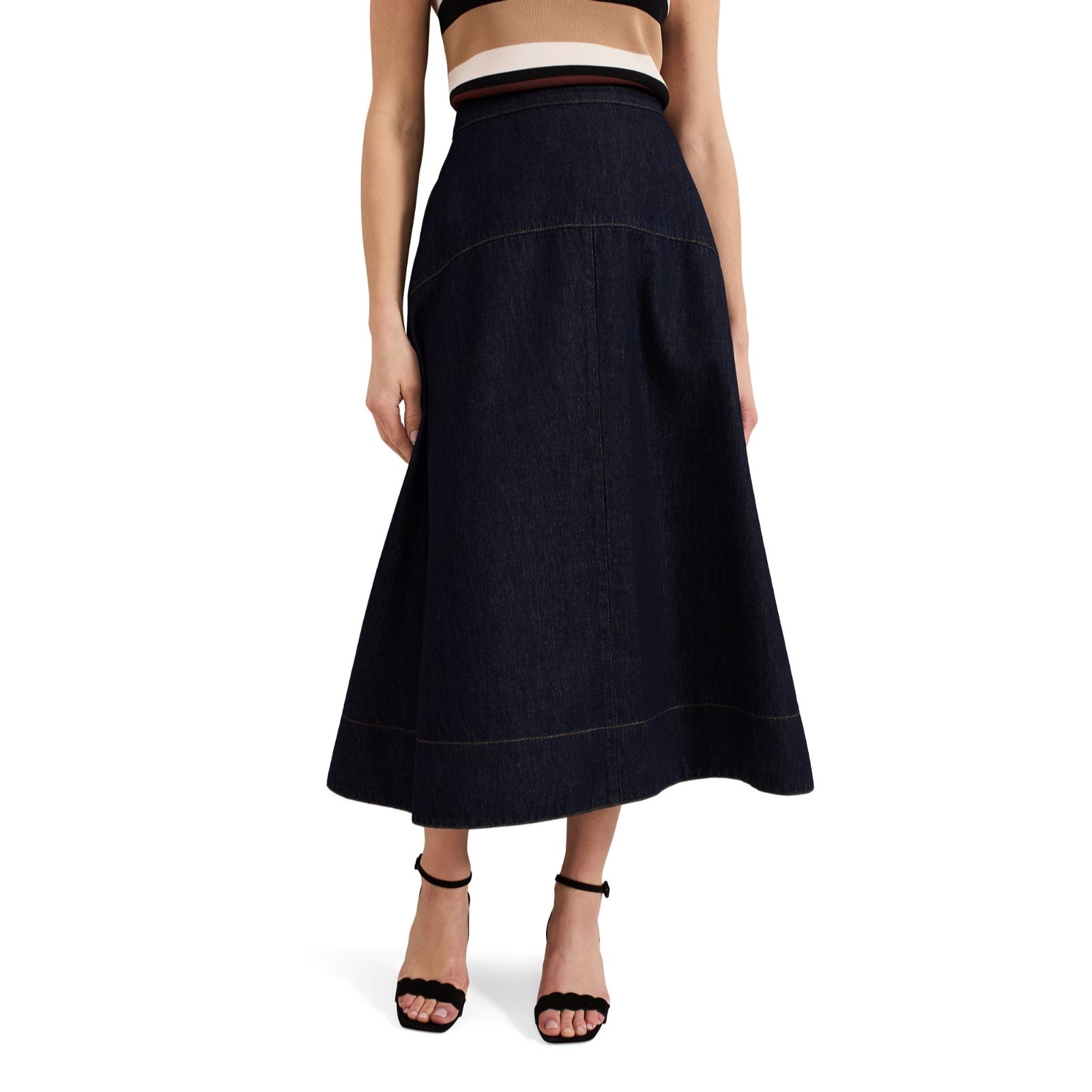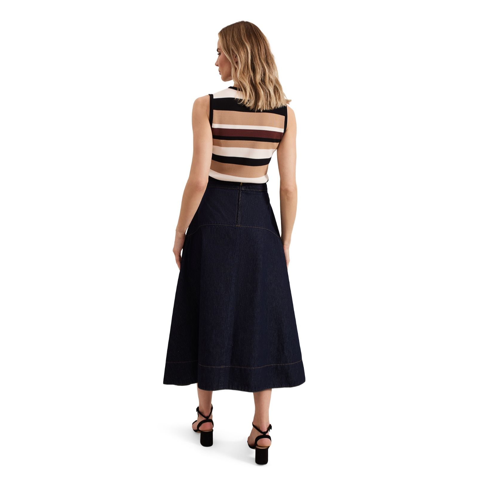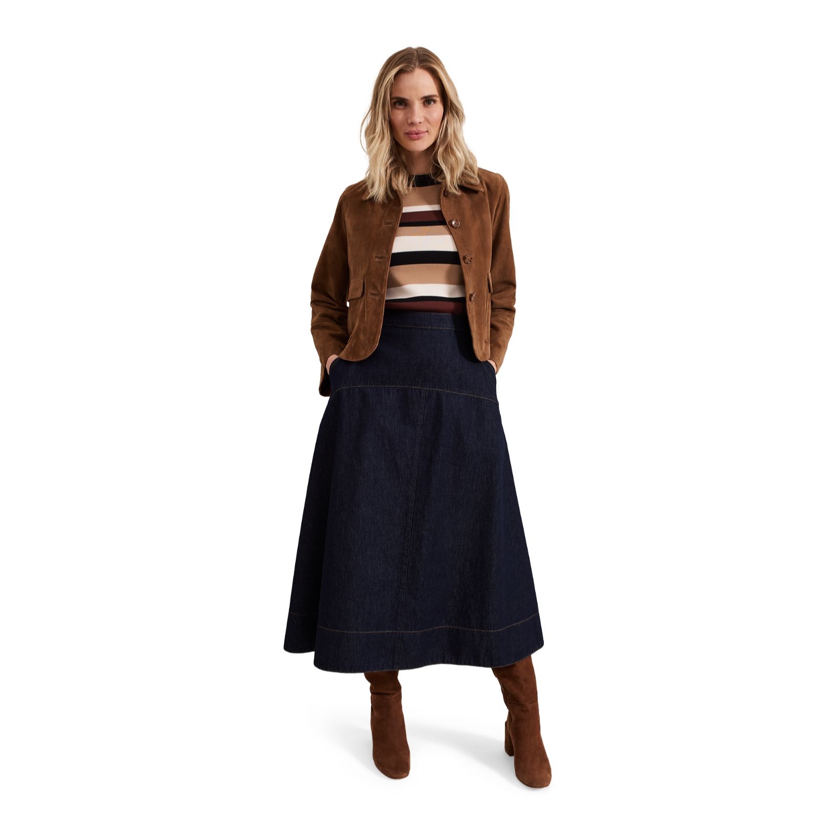 Elevate your wardrobe with the timeless appeal of the Phase Eight Mavis Denim Skirt. This dark wash denim skirt features a panelled design that offers a beautiful fit while adding a touch of sophistication to your outfit. Ideal for both casual days out and more polished occasions, this versatile skirt can be paired with a simple blouse and ankle boots for a chic, everyday look.
