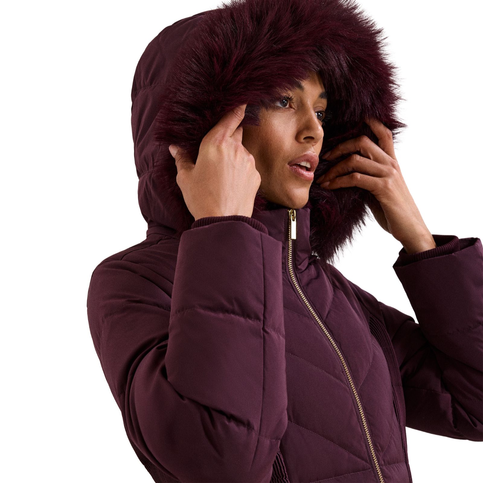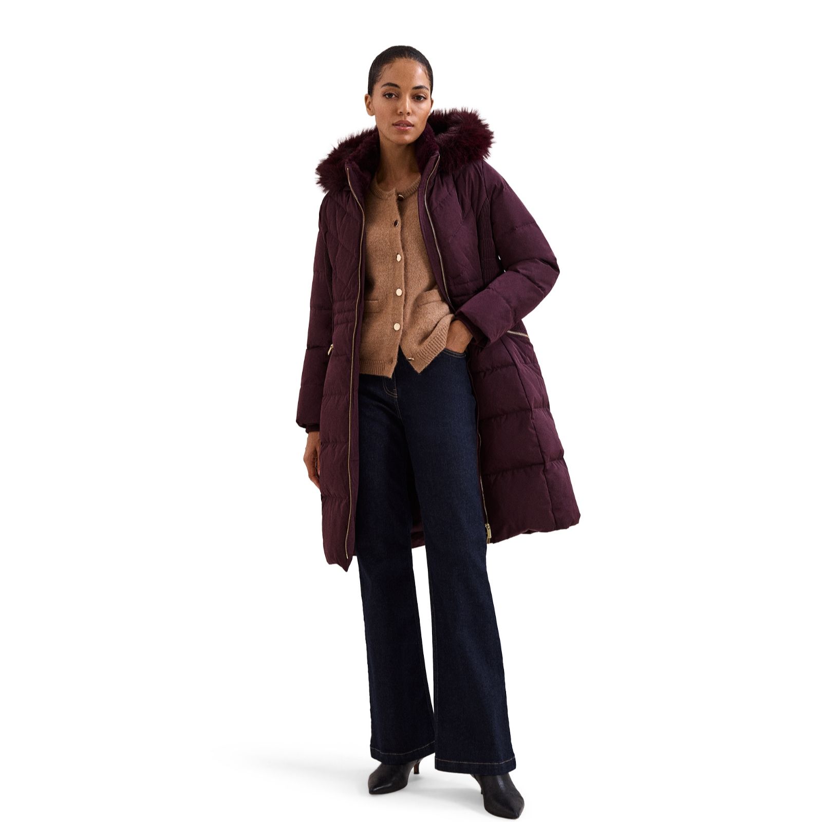 With its luxurious fur shawl collar and rich burgundy hue, the Amber Midi Puffer Jacket from Phase Eight brings a touch of elegance to your cold-weather wardrobe. Whether youre heading out for a crisp morning walk or dressing up for evening drinks, this puffer offers warmth and style in equal measure. Try layering it over a chunky knit and tailored trousers for a chic, contemporary look.