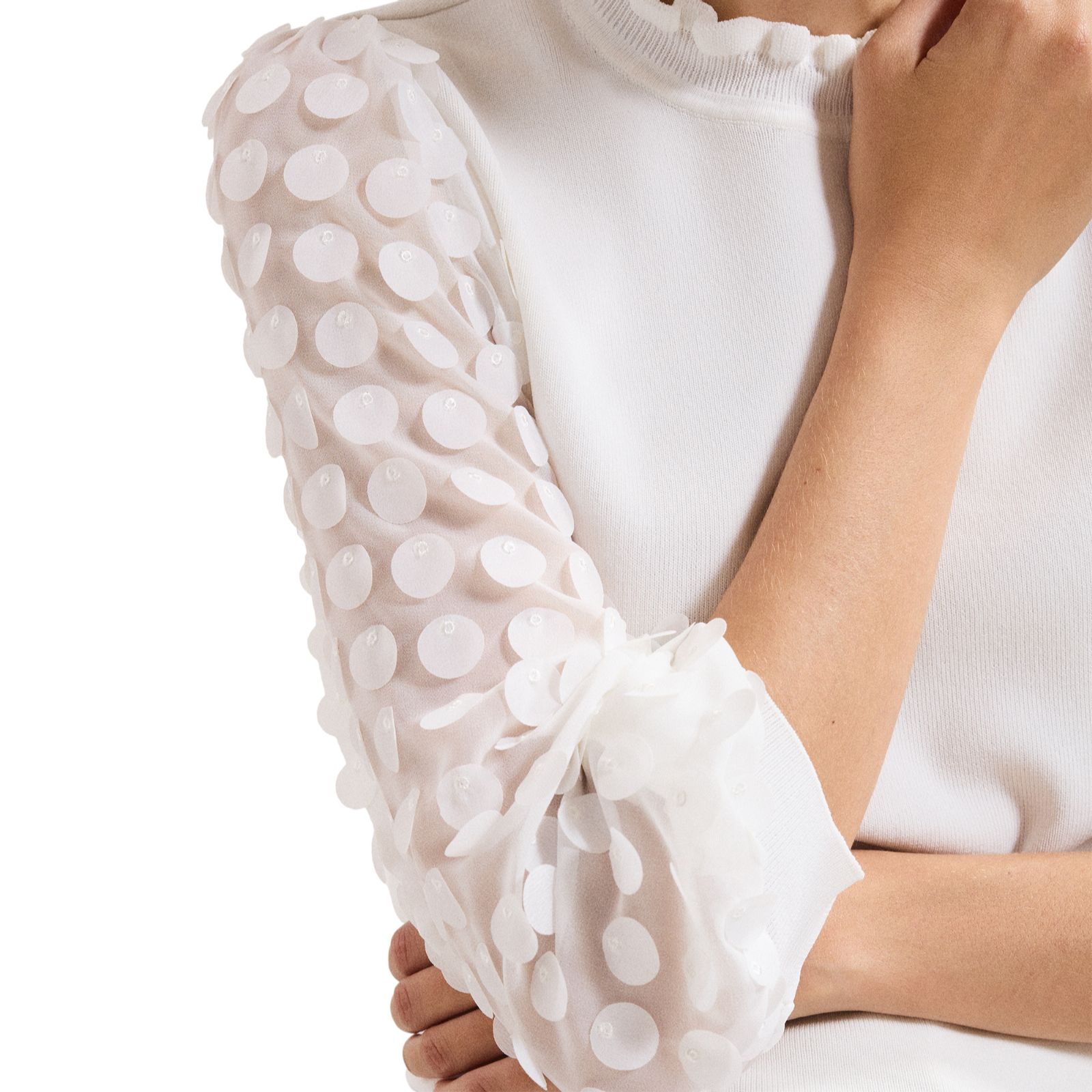 • Long sheer sleeves with applique finish