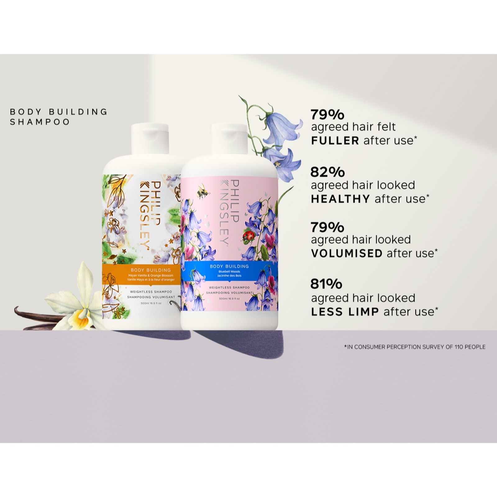- 1 x Body Building Shampoo (500ml) - in Bluebell Woods or Mayan Vanilla & Orange Blossom. A gently cleansing shampoo that helps to add volume, body and shine. Suitable for men and women with fine textured, limp, lightweight flyaway hair and chemically processed/colour treated hair, even when used frequently. Enriched with hydrolysed hair keratin and natural cellulose