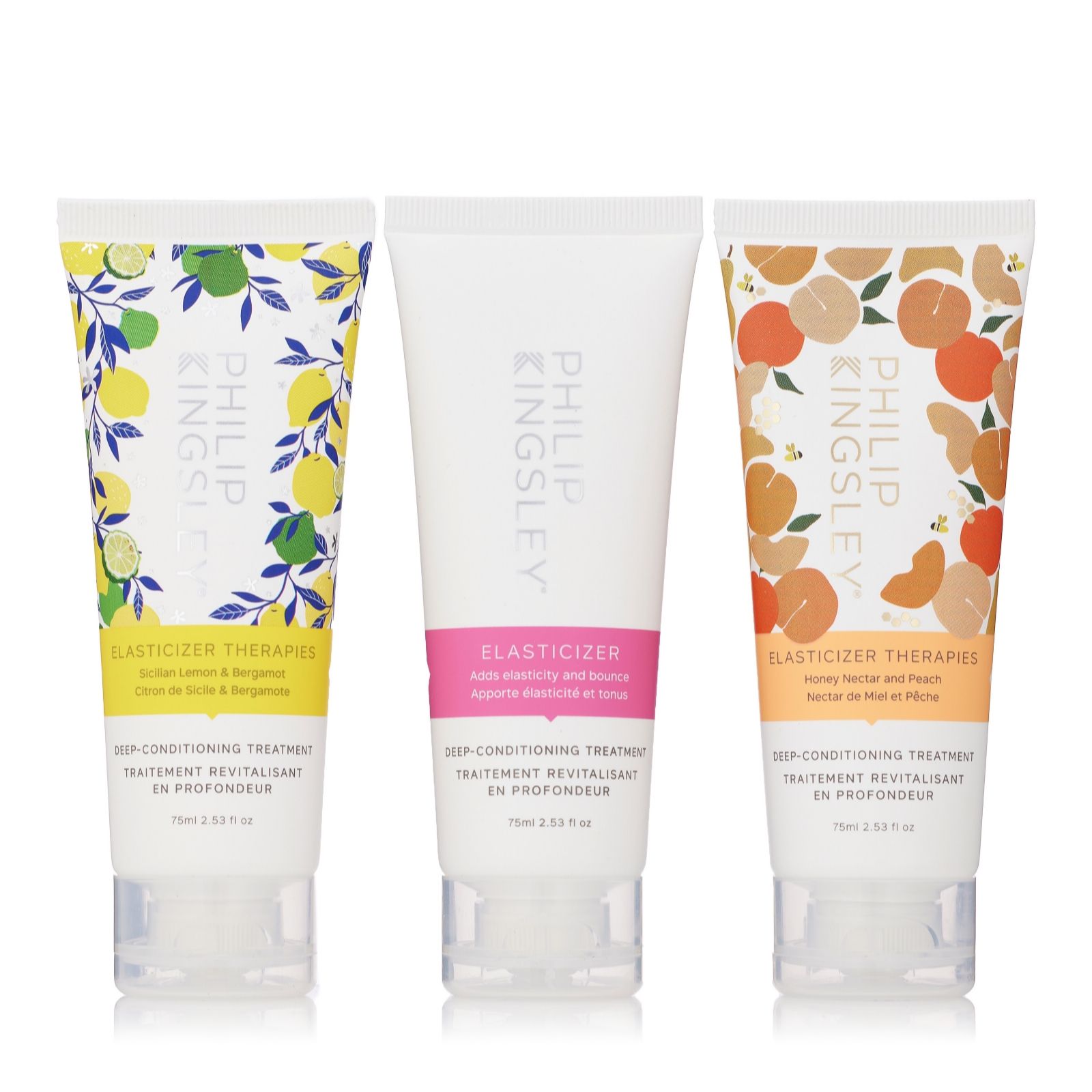 Experience the ultimate hair transformation with the Philip Kingsley Elasticizer 75ml Collection. This luxurious set includes the original Elasticizer and two fragrant variations: Sicilian Lemon & Bergamot and Honey Nectar & Peach. Each pre-shampoo treatment is designed to help boost elasticity, moisture and strengthen, leaving your hair bouncy, shiny and manageable. Perfect for those seeking an indulgent haircare experience, these treatments offer a sensory escape to Mediterranean landscapes while working to enhance your hair's vitality.