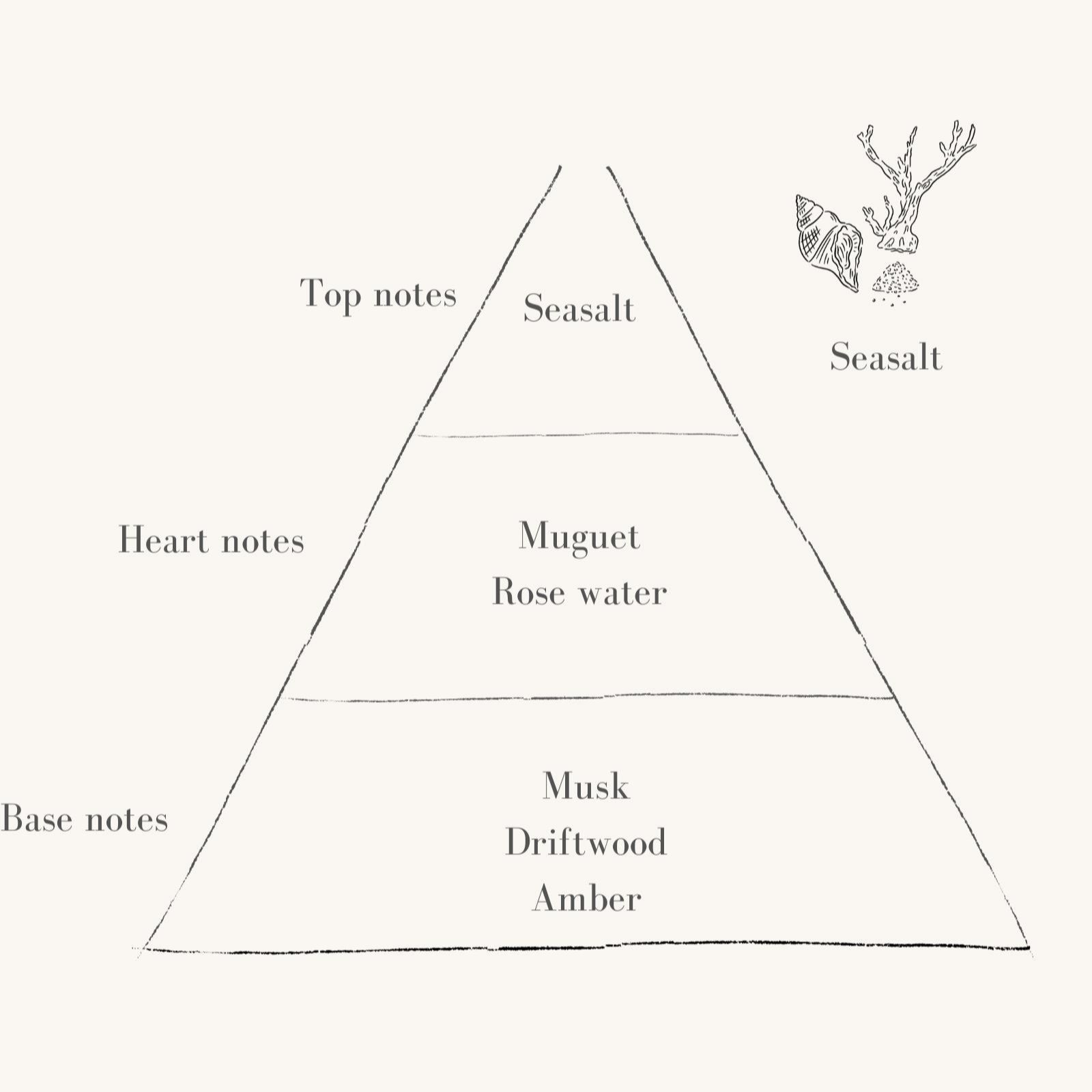 - Seasalt scent: sea salt, muguet, rose water, white musk, driftwood, amber