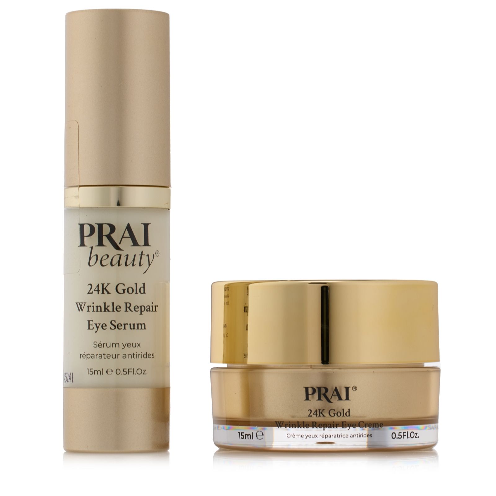 Elevate your routine with this 24K Gold Wrinkle Repair Eye Collection from Prai, featuring a sumptuous eye creme and a silky serum designed to help your eye area look brighter and more luminous. Whether you're prepping for a special occasion or winding down after a long day, this duo is perfect for helping to create a refreshed, radiant look in your beauty ritual.