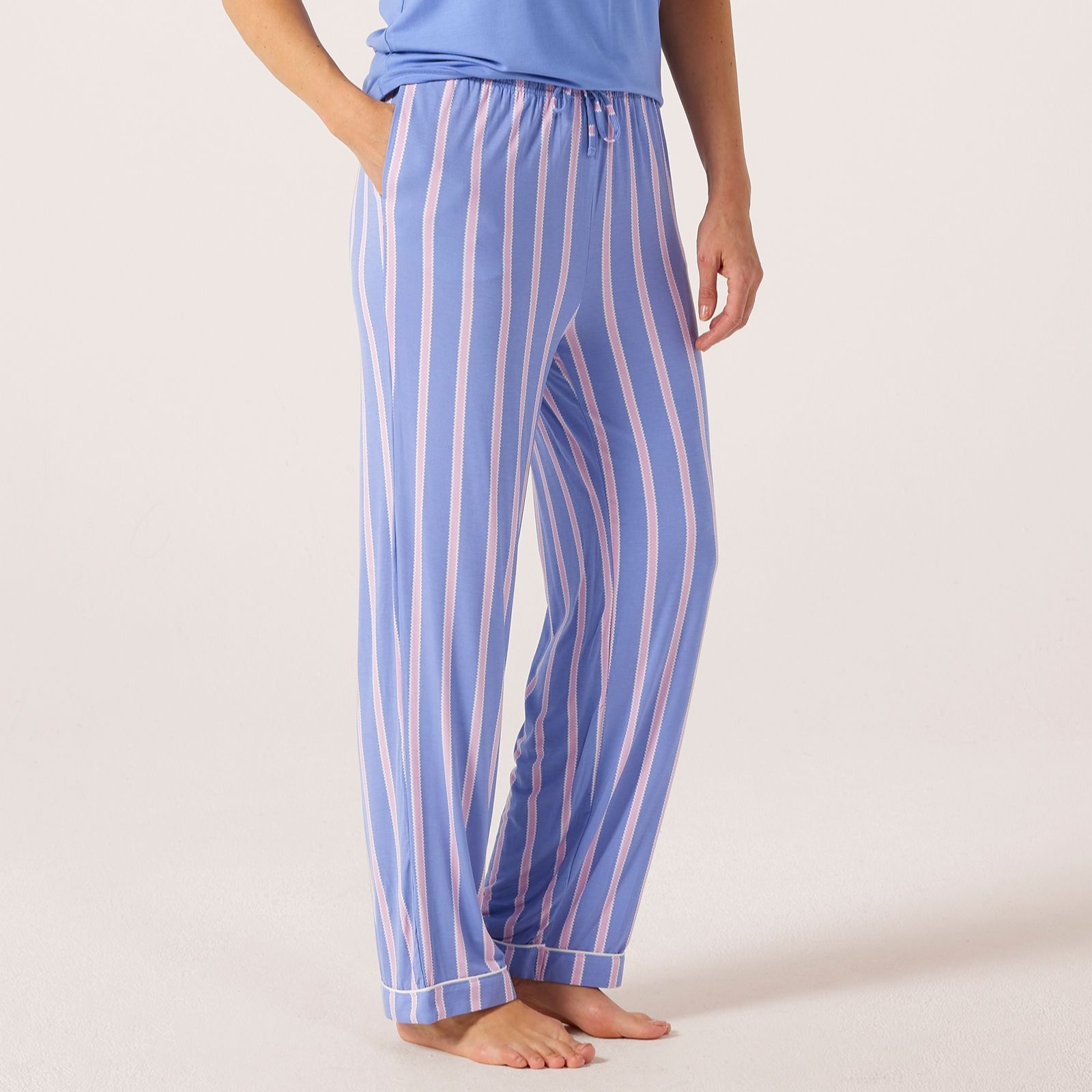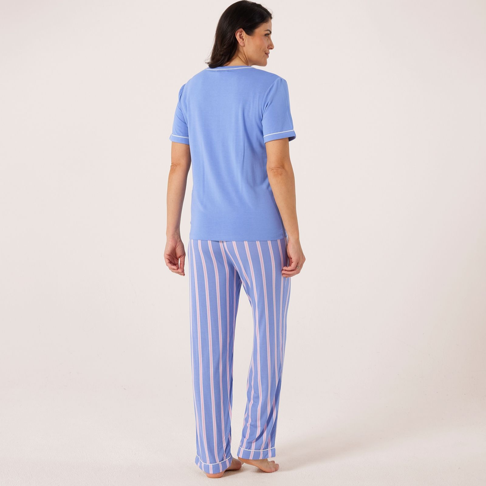 Experience ultimate comfort with the Pretty You London Bamboo Tee and Trouser Set. This delightful set features a relaxed-fit T-shirt with contrast satin piping and a crew neck, paired with straight-leg trousers in a playful stripe print. The trousers boast an elasticated drawstring waist and handy side pockets, making them perfect for lounging or sleeping. Made from a soft and breathable bamboo blend, this set ensures you stay cosy and cool all night long.