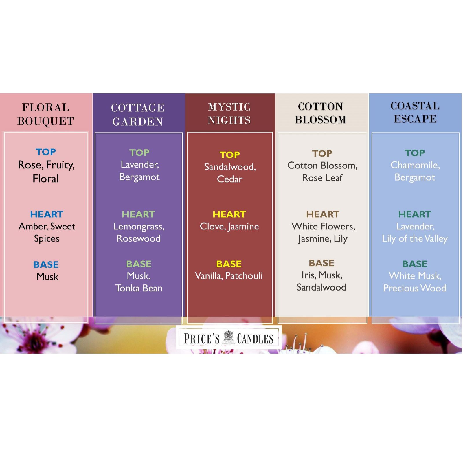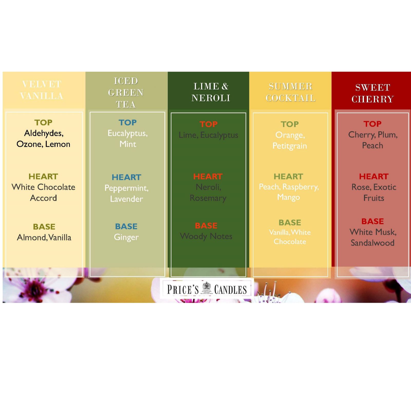 - Fragrances: Coastal Escape, Cotton Blossom, Country Garden, Floral Bouquet, Iced Green Tea, Lime and Neroli, Mystic Nights, Summer Cocktail, Sweet Cherry and Velvet Vanilla