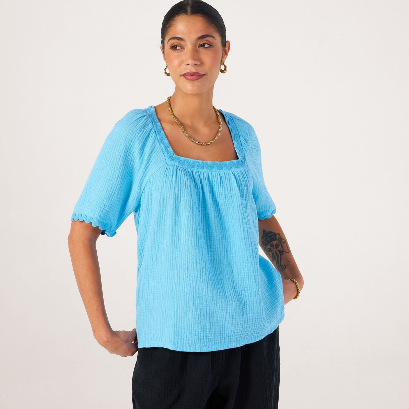 - the ric rac trim across the sleeves and neckline brings a pretty finish to this top that elevates it for all your spring and summer adventures, whether it's for brunch with friends or a picnic in the park.