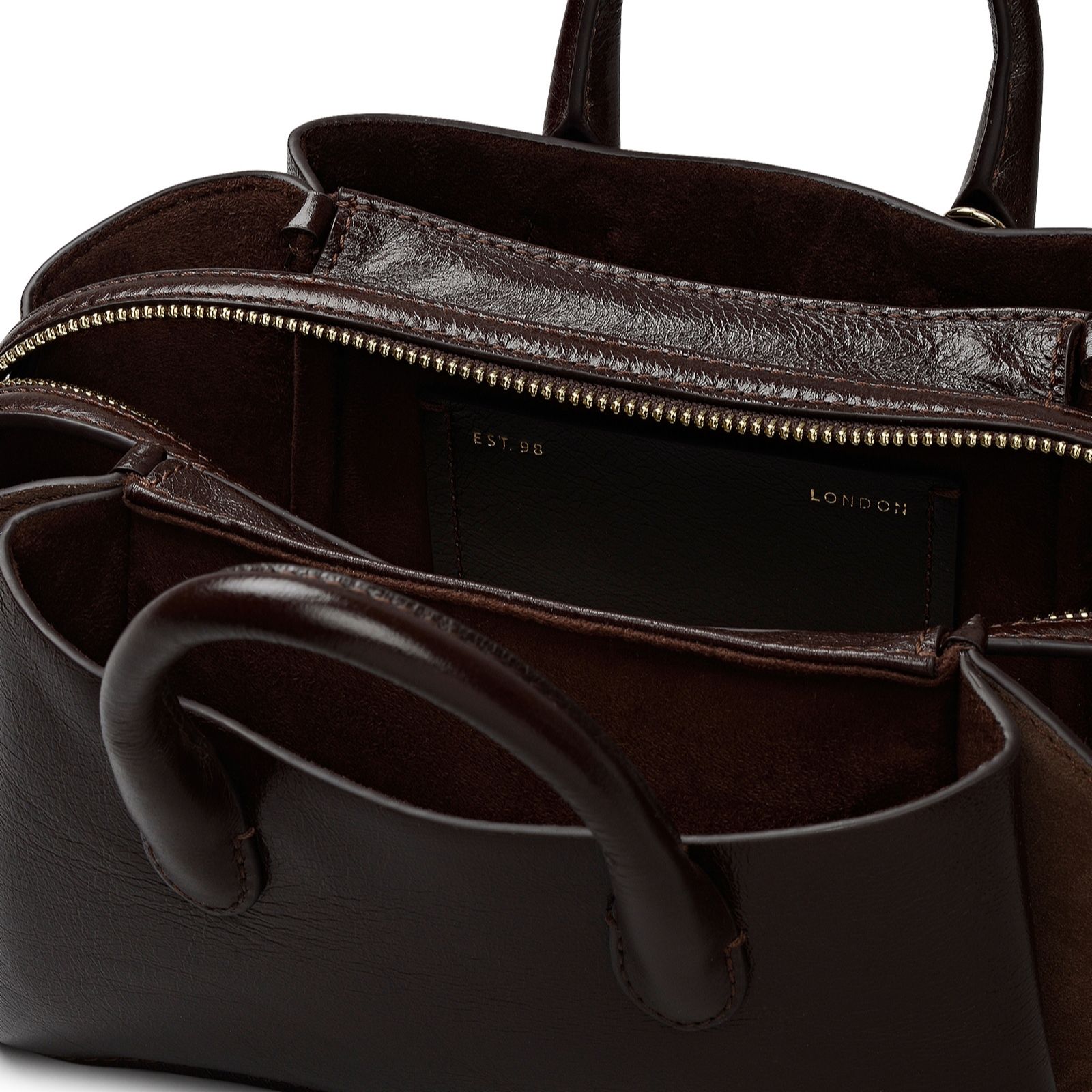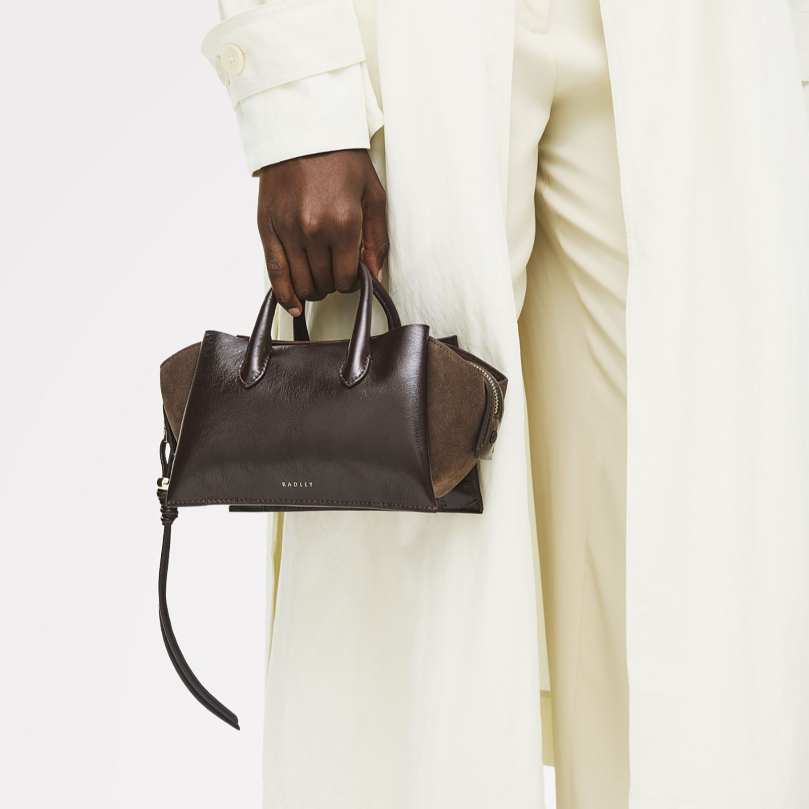 Discover the timeless charm of The Romilly small ziptop grab bag from Radley London, blending crinkled sheen leather and plush suede with a soft folded silhouette inspired by Radley's archives. Whether you let the long zip pulls hang loose for a relaxed look or tuck them in for polished appeal, this bag transitions seamlessly from day to evening, making it a versatile companion for work, weekends or special occasions.