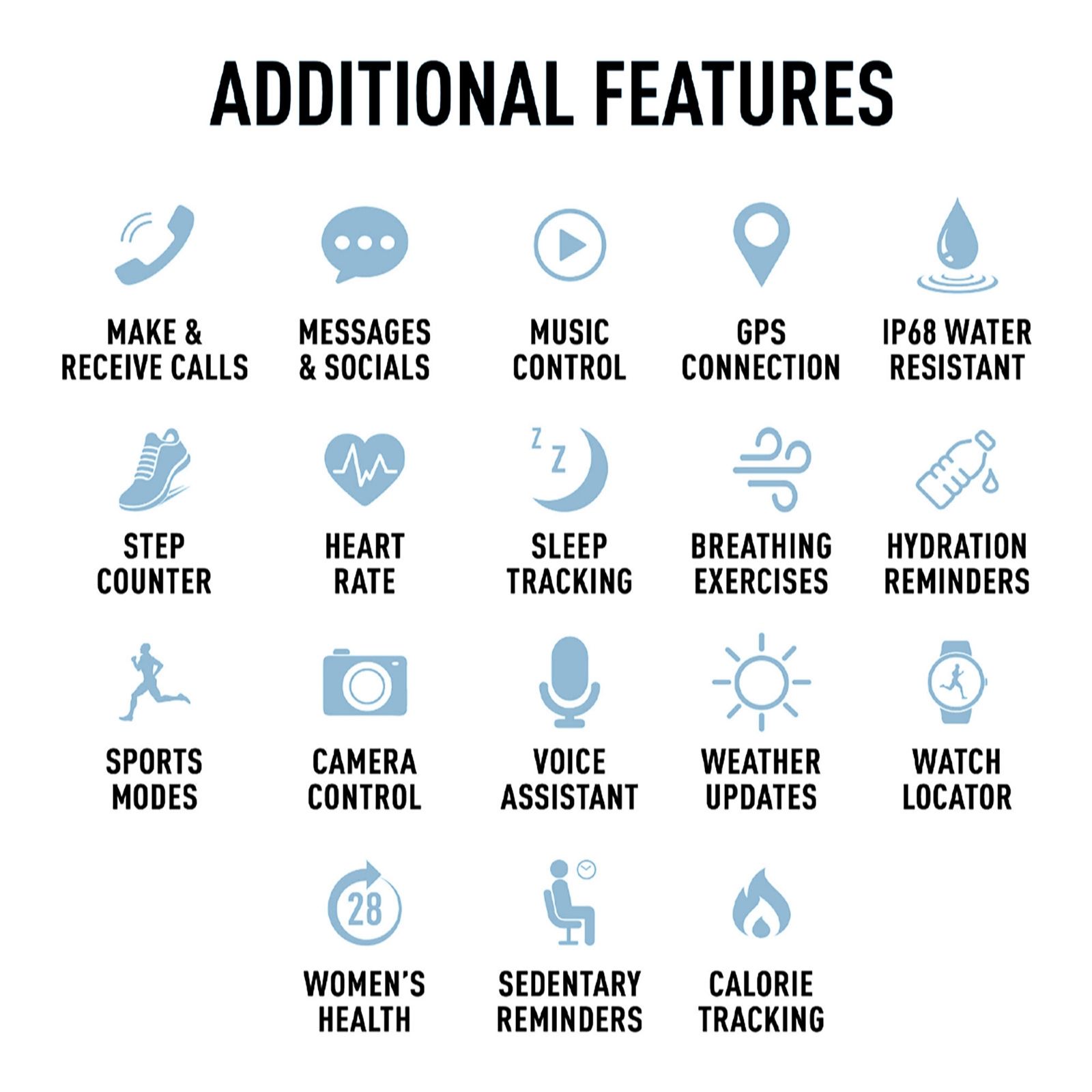 - Wellness tracking: steps, heart rate, blood oxygen, calories, sleep analysis