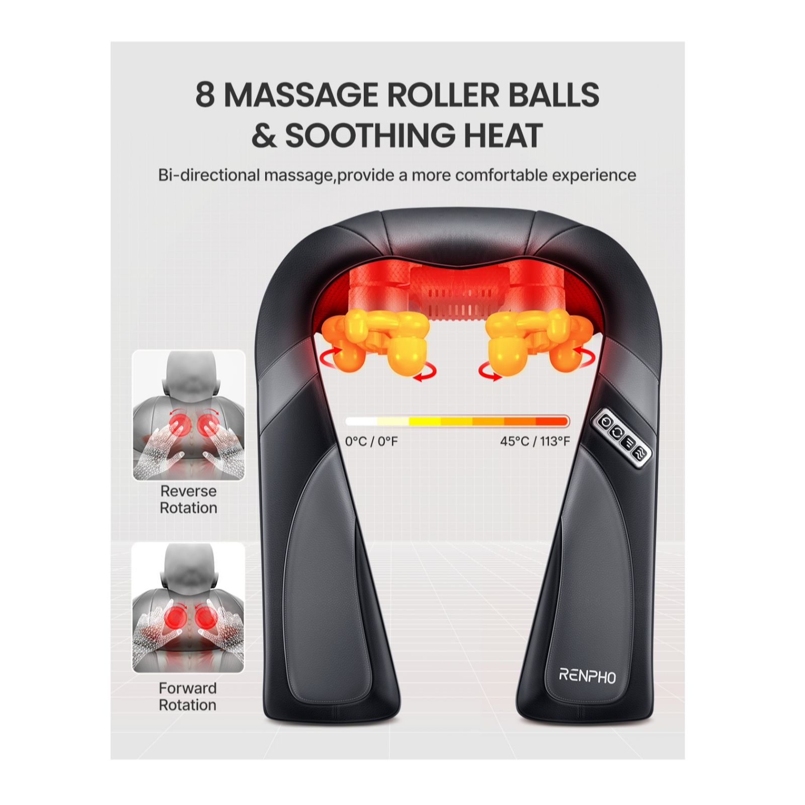 The RENPHO Shiatsu Neck & Shoulder Massager is your portable solution to eliminate fatigue, stress and muscle pain. With its 8 deep kneading massage nodes and an adjustable neck pillow, it's designed to provide you with the ultimate massage experience. It covers your entire neck and back, reaching even the lowest parts of your waist. Conveniently designed to fit on most chairs, you can enjoy a soothing massage at home or in the office. Plus, its optional heat function offers gentle warmth for an even better overall massage experience.