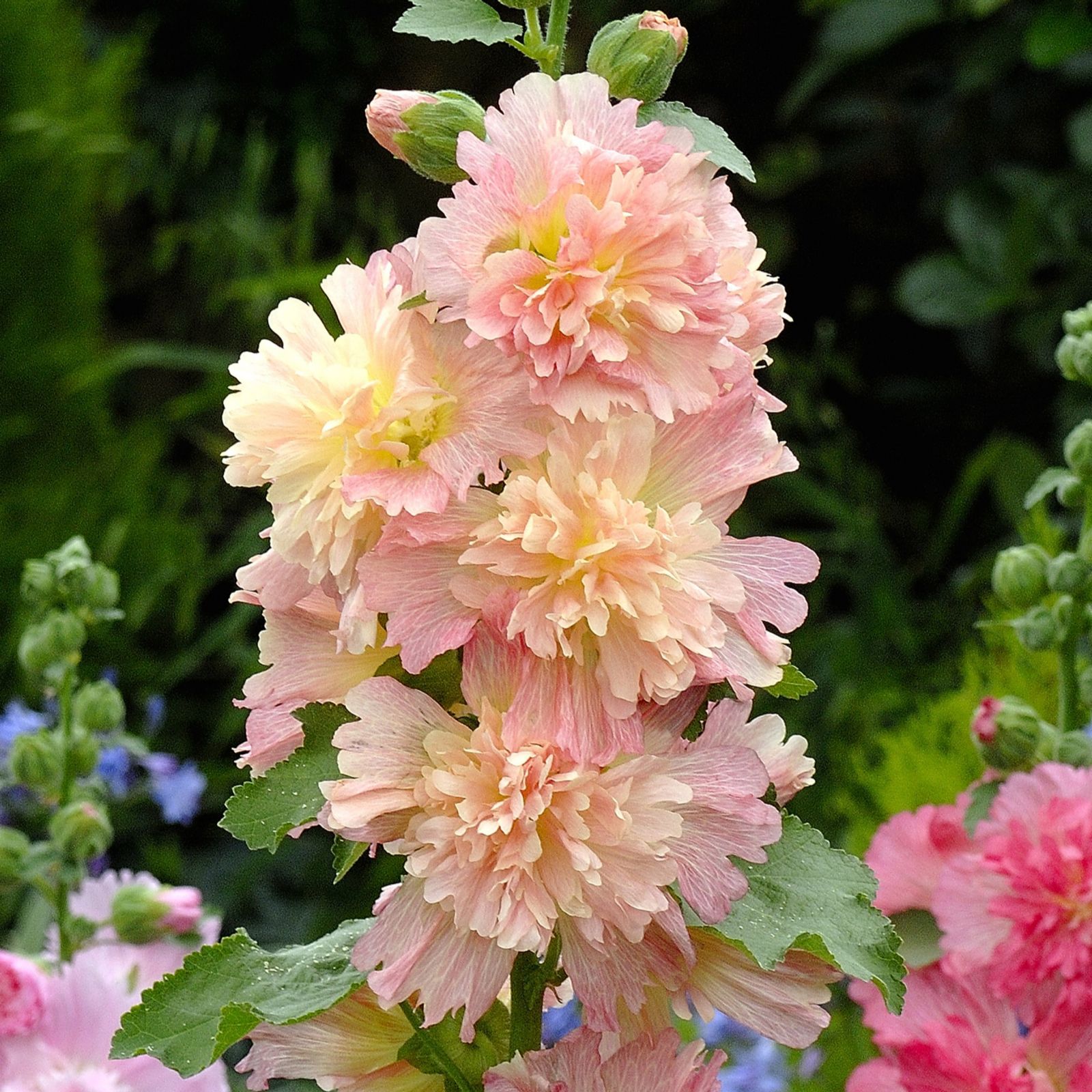 Experience the beauty and charm of cottage gardens with Richard Jackson's Hollyhock Spring Celebrities Garden Ready Plants. These unique, compact hollyhocks feature stout, upright stems adorned with frilly, anemone-centred blooms in a delightful range of pastel colours. Ideal for adding a touch of elegance to beds, borders and containers, these plants are easy to grow, low maintenance, and drought tolerant. Flowering from June to September, they attract pollinating insects, enhancing your garden's biodiversity.