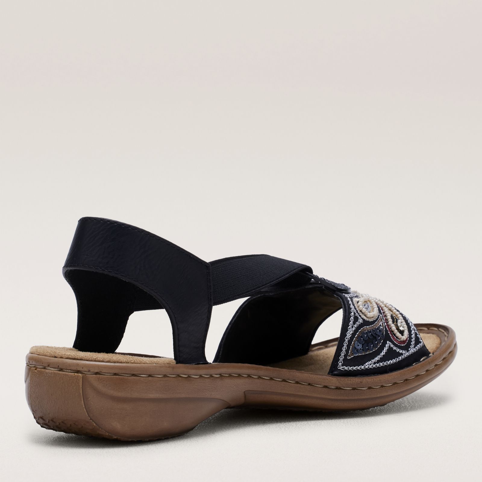Add a touch of sparkle to your day with these Rieker embellished sandals. Adorned with delicate sequin applique, these slip-on sandals boast beautifully handsewn craftsmanship that ensures a lightweight feel, complemented by an elasticated fit and cushioned footbeds for easy, all-day wear. Pair them with a breezy sundress or your favourite cropped trousers to truly show them off.
