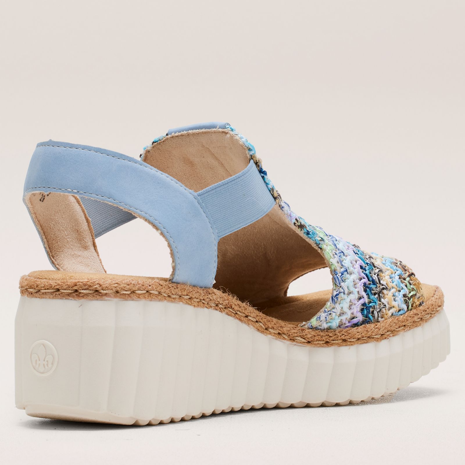Step into effortless style with the Rieker woven wedge sandal, featuring a lightweight design and multi-coloured textile upper. Perfect for both casual strolls and summer soirees, these sandals offer elasticated access and a cushioned footbed for ultimate comfort. Pair them with a flowy dress or your favourite jeans for a chic, versatile look that will keep you comfortable all day long.