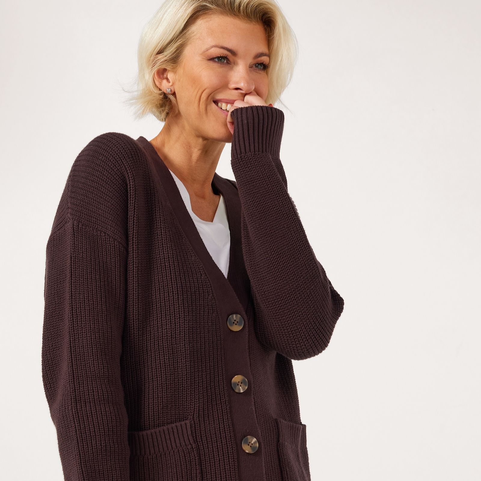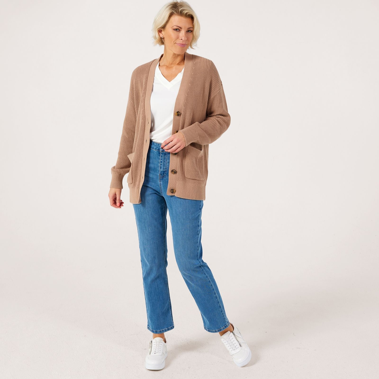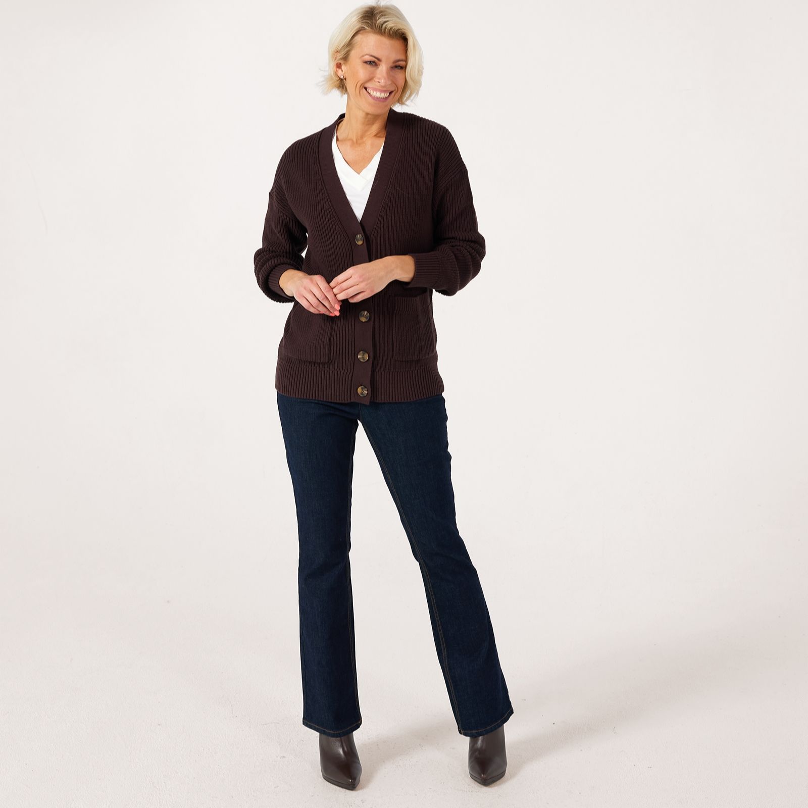 Button up in effortless style with the Ruth Langsford button front cardigan, designed with a smart V-neck, handy pockets and a five-button fastening that make it a true wardrobe staple. The longer rib at the hem and cuffs adds a refined finish, making it a versatile piece for layering on cooler days or dressing up for evening outings. Try pairing it with tailored trousers or your favourite jeans for a chic, relaxed look.