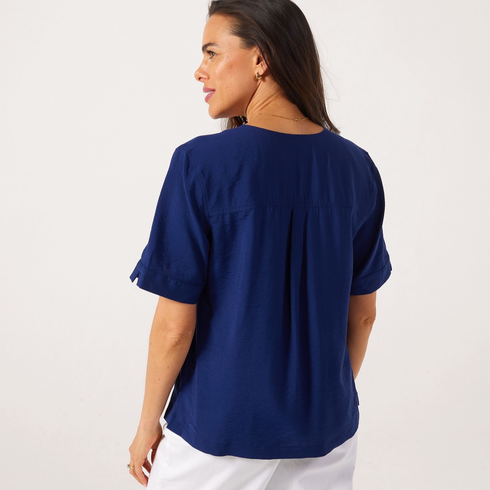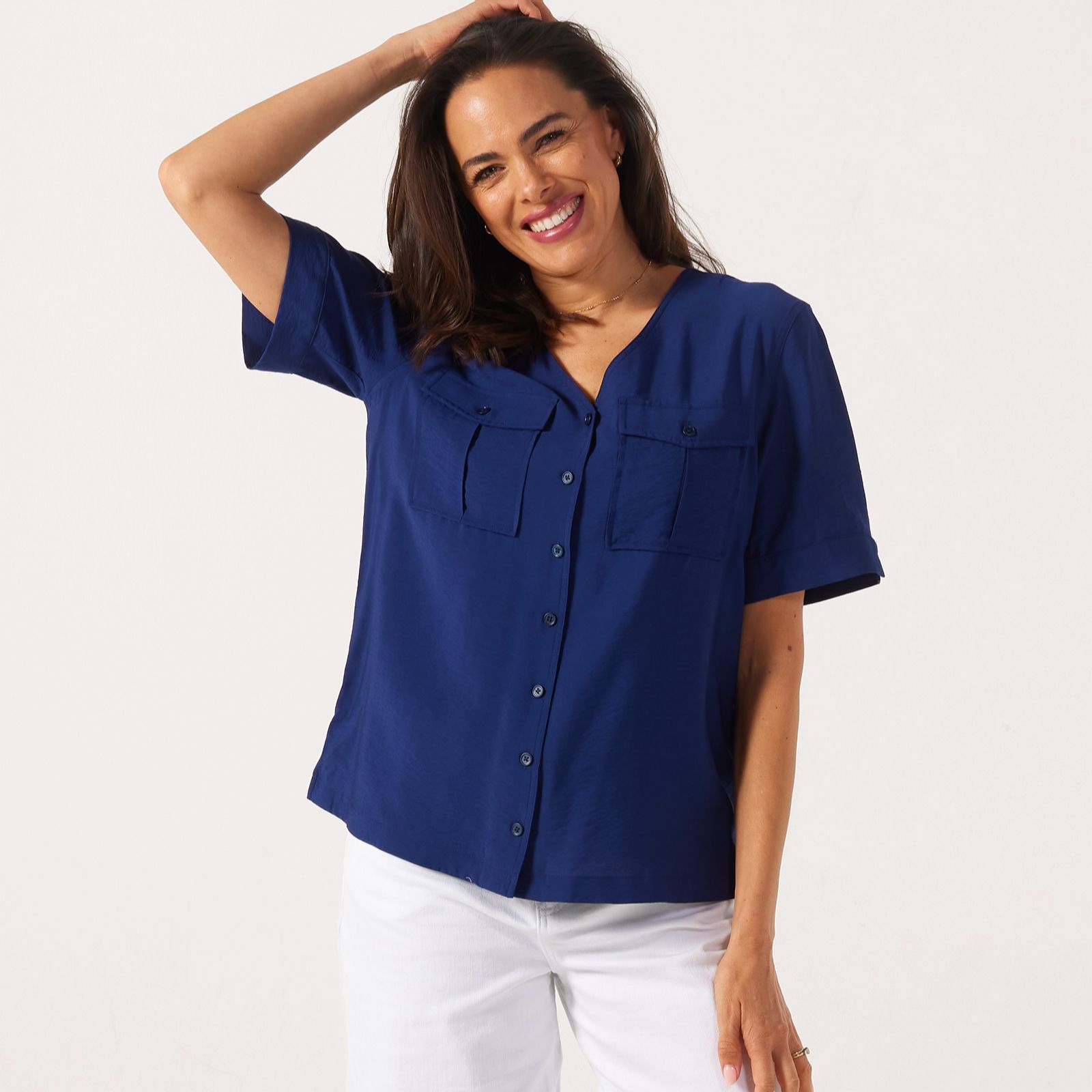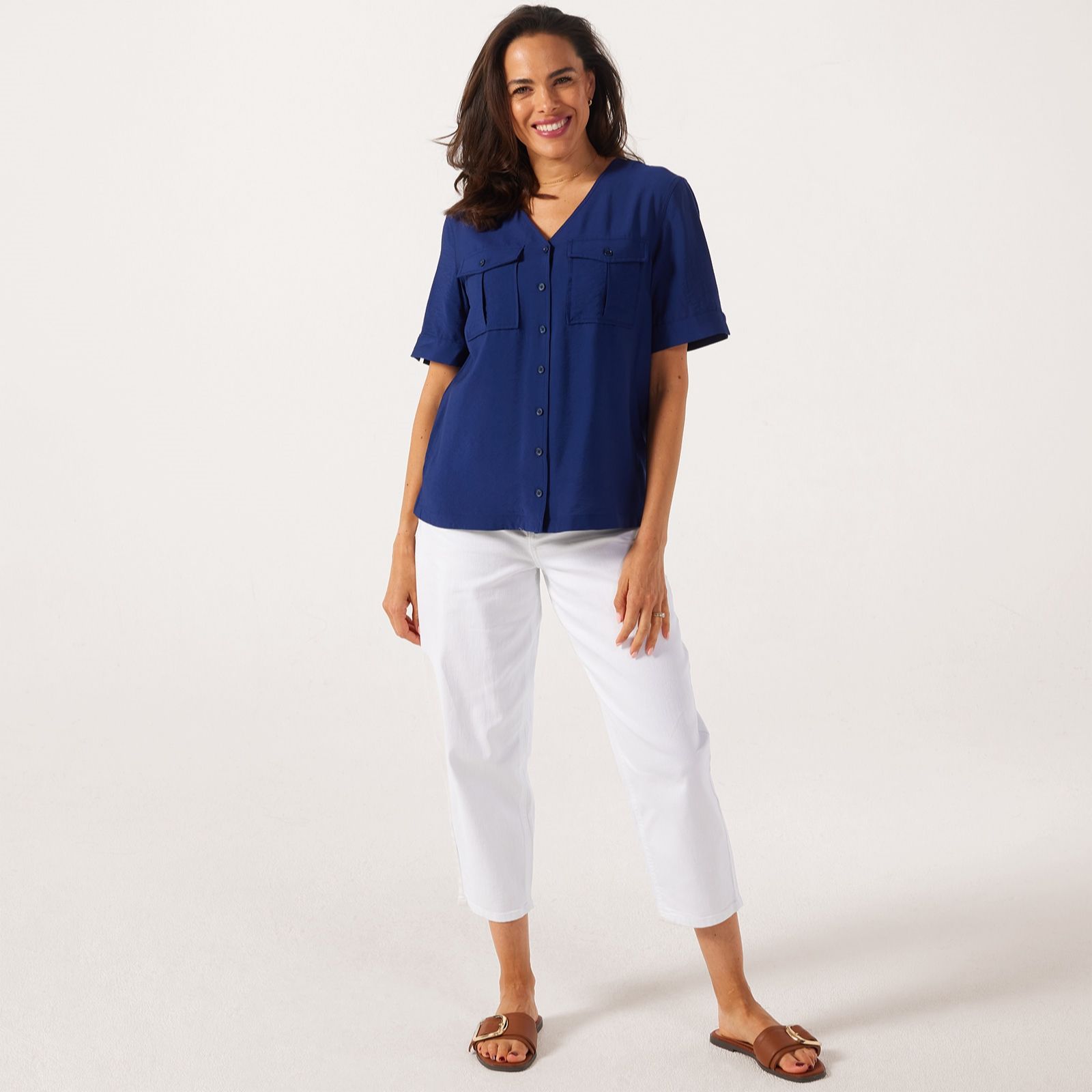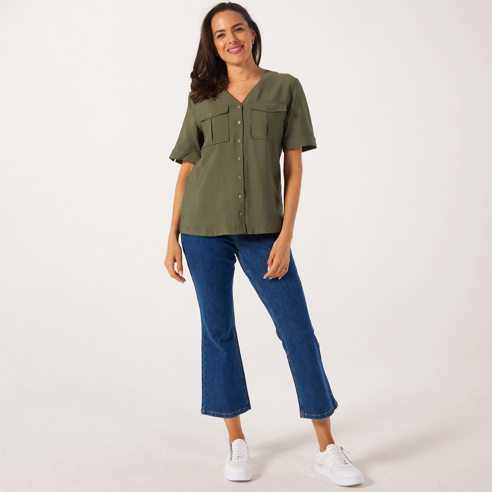 Effortlessly chic and ready for any occasion, the collarless utility blouse from Ruth Langsford offers a modern twist on classic style. Its sleek, woven design features short sleeves and a gorgeous V-neckline with button fastenings that add a touch of sophistication to your outfit. Perfect for both workdays and weekend outings, this versatile blouse can easily be dressed up with tailored trousers or kept casual with your favourite jeans for a relaxed yet polished look.