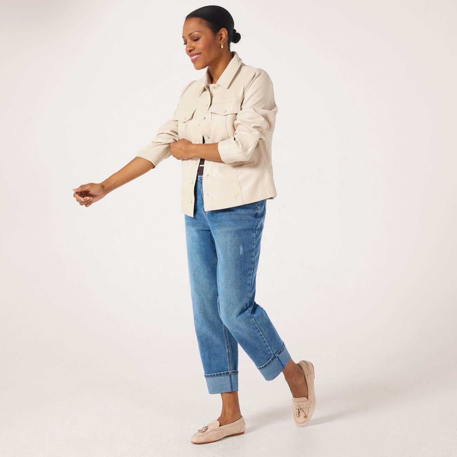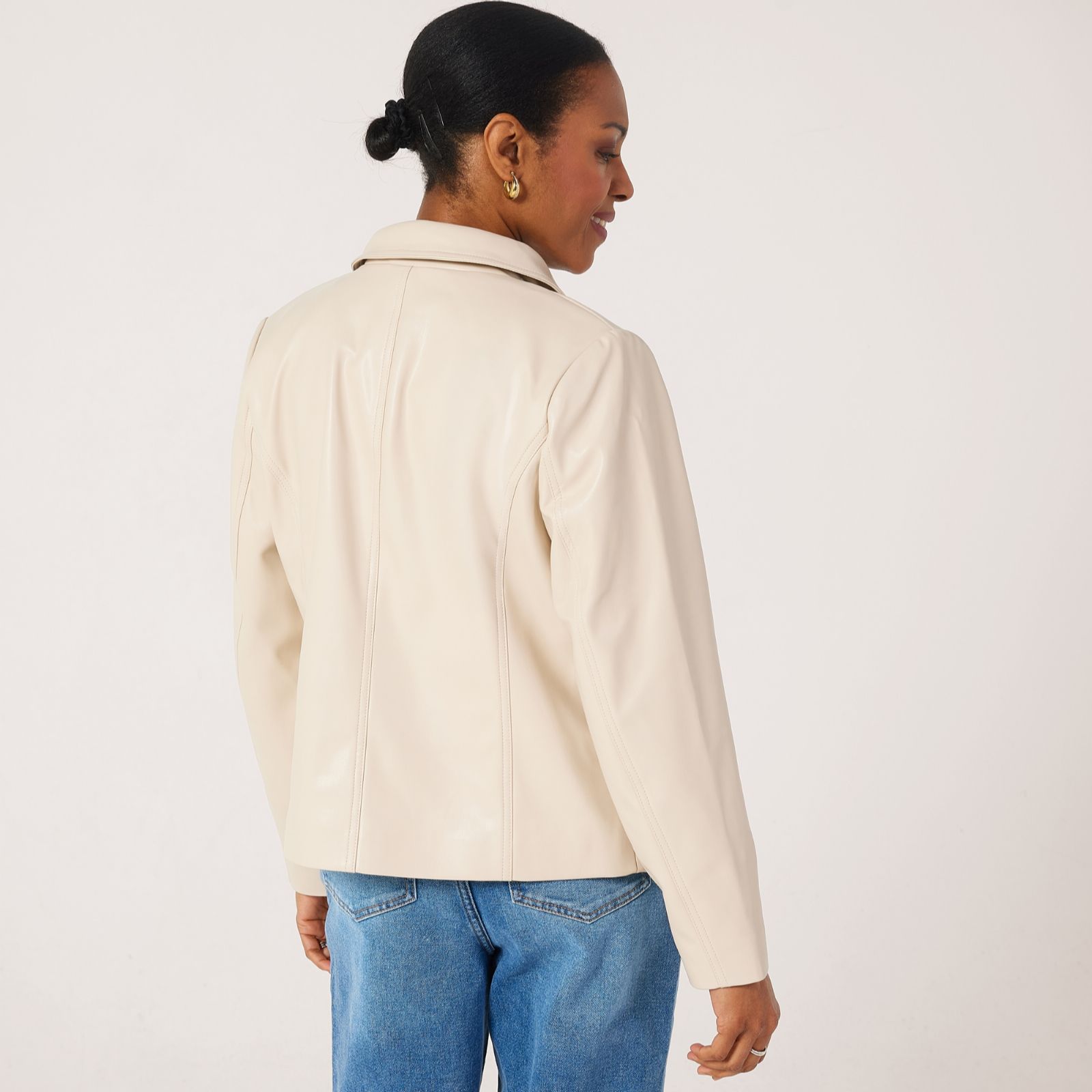 A modern take on a timeless favourite, this faux leather button front jacket from Ruth Langsford brings polished edge to everyday dressing. With its sleek silhouette and tailored detailing, it's perfect for adding a touch of sophistication to casual looks or elevating evening ensembles. Style it over a crisp shirt and jeans for effortless chic, or layer atop a dress for a smart finish.