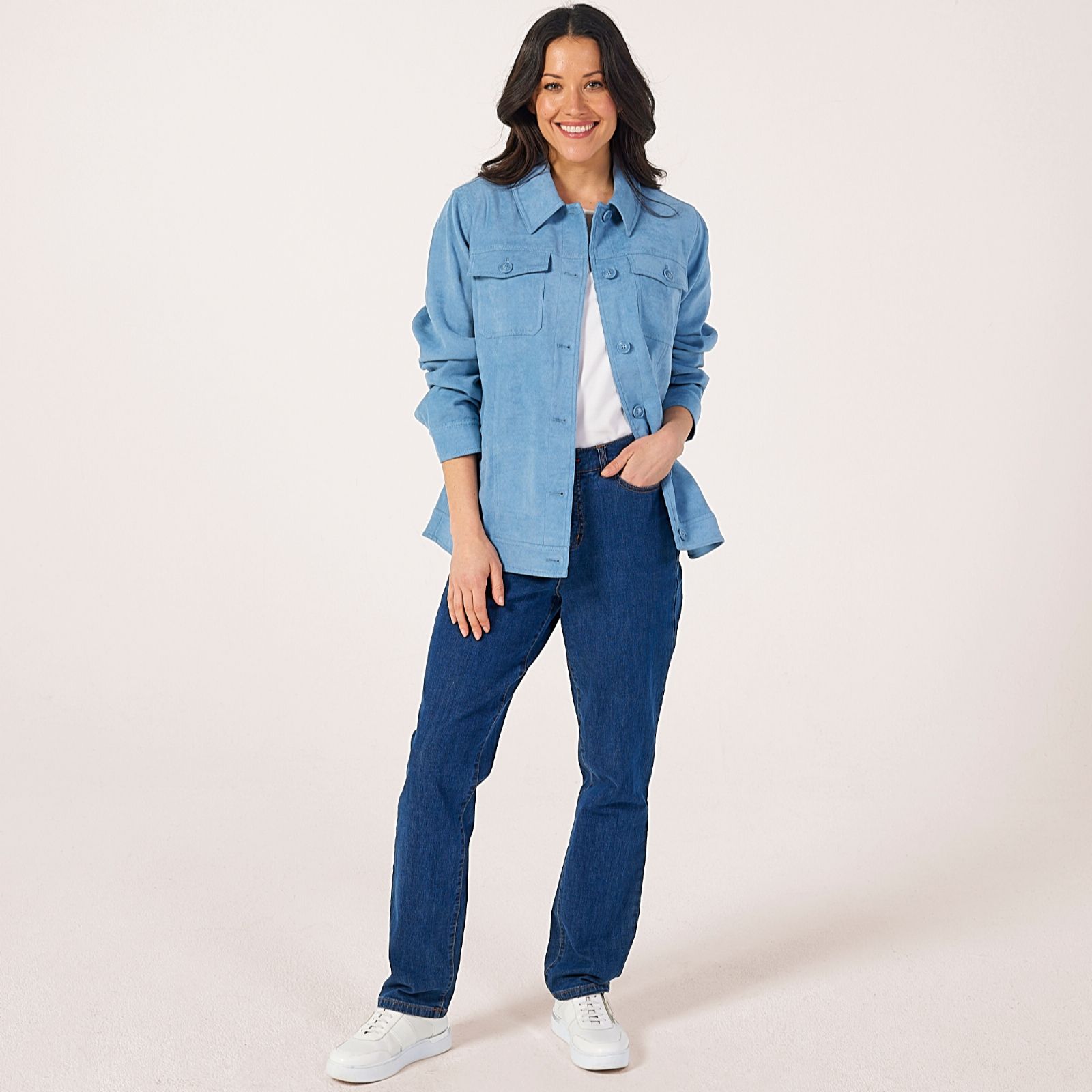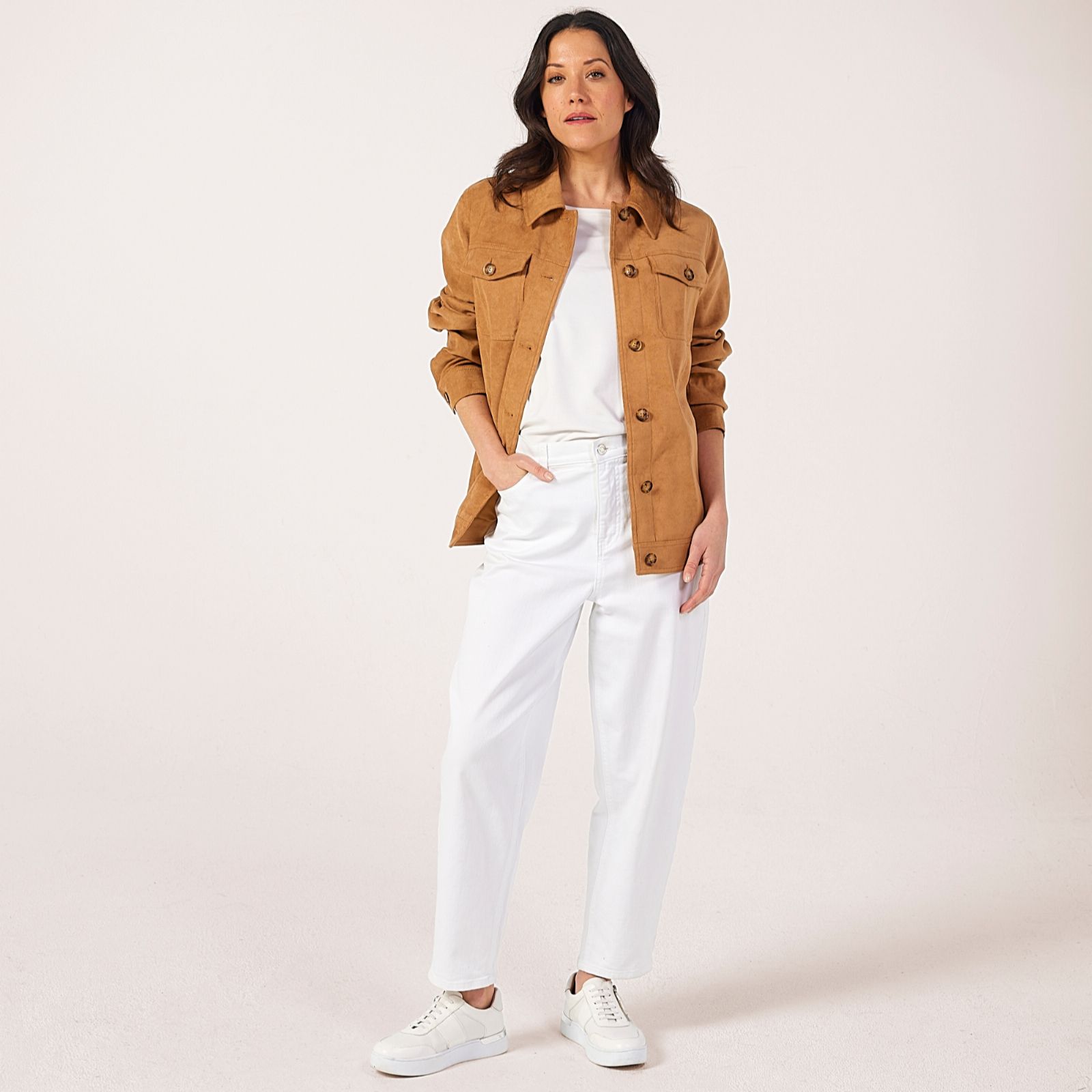 Finish your look with the effortless sophistication of the Ruth Langsford Longline Jacket. With its beautifully soft faux suede finish and elegant longline cut, this jacket brings a touch of elegance to any occasion, whether you're heading to the office, out for lunch or layering up for a weekend stroll. Versatile and easy to style, try pairing it with slim jeans and ankle boots for a polished yet relaxed ensemble.