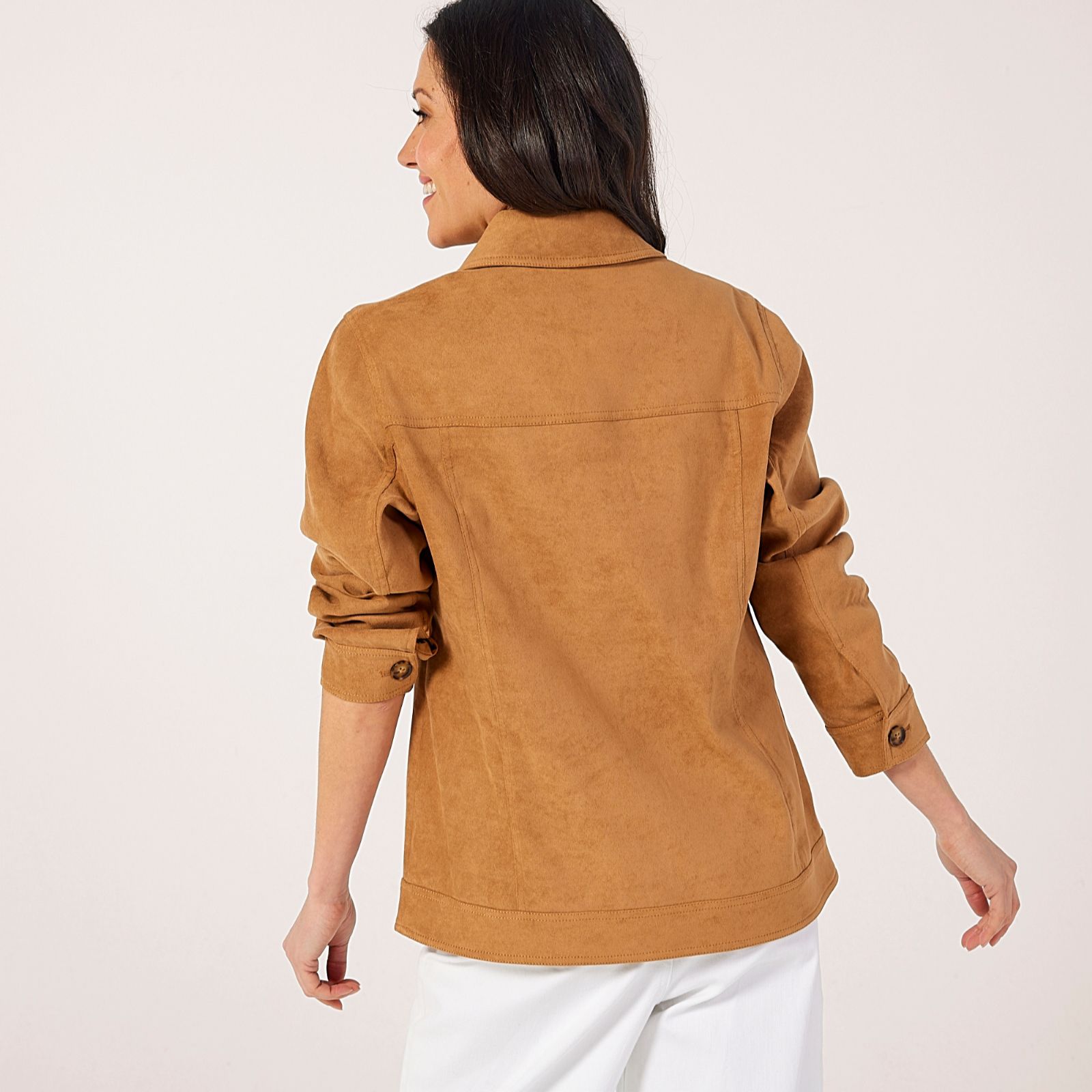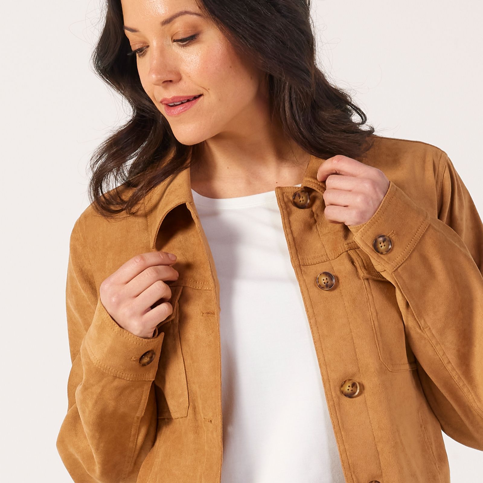 - Button fastening and woven suededette texture