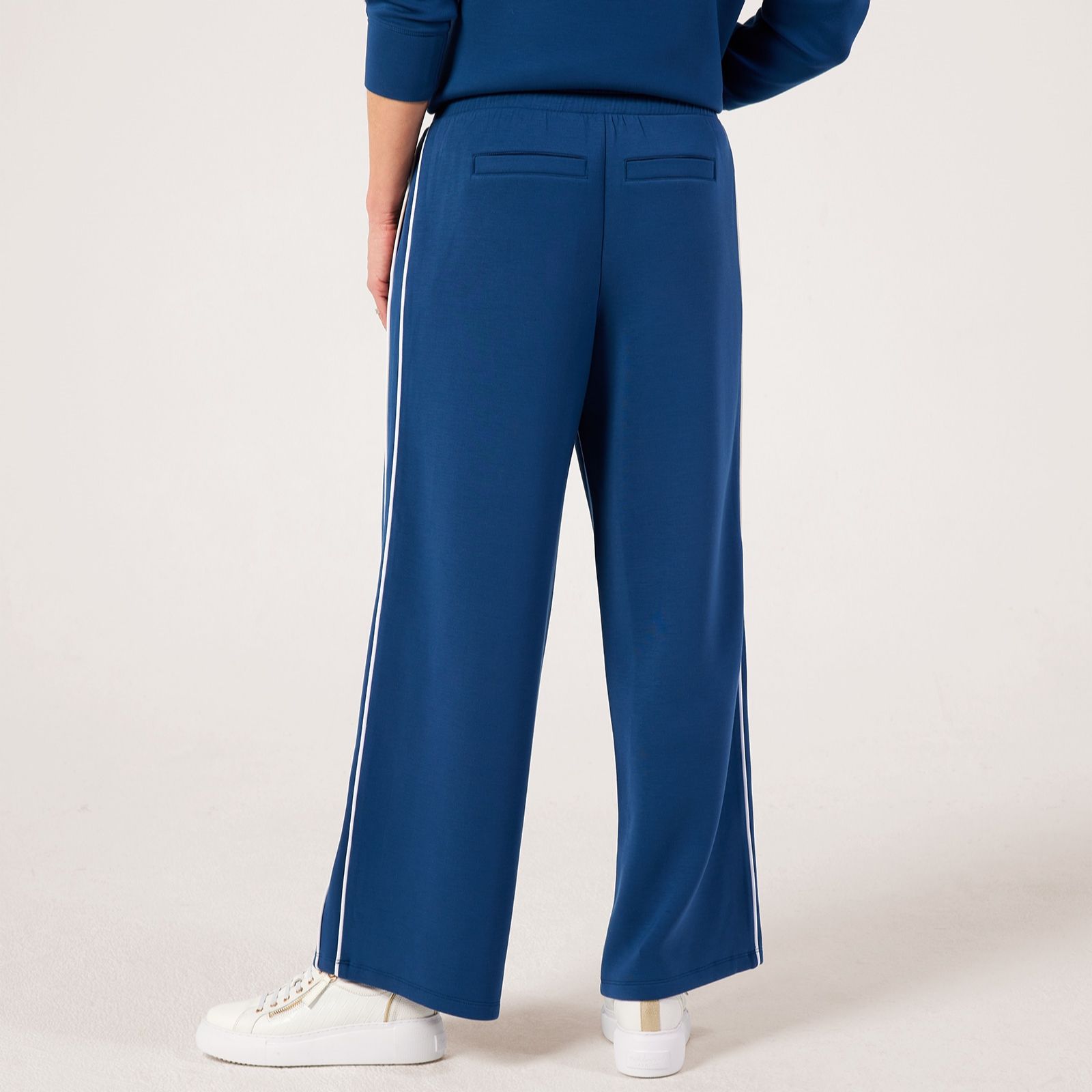 Step out in style with these wide leg trousers from Ruth Langsford, beautifully detailed with side piping and a flattering flat front waistband. The soft elasticated back ensures comfort, while functional side pockets add practicality to your everyday look. Perfect for everything from relaxed weekends to smart-casual days at work, these trousers pair effortlessly with a crisp blouse and trainers for modern appeal.