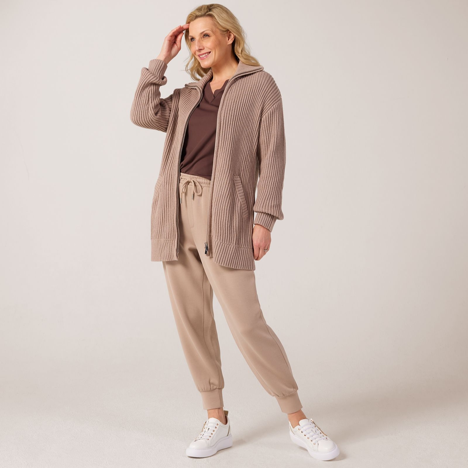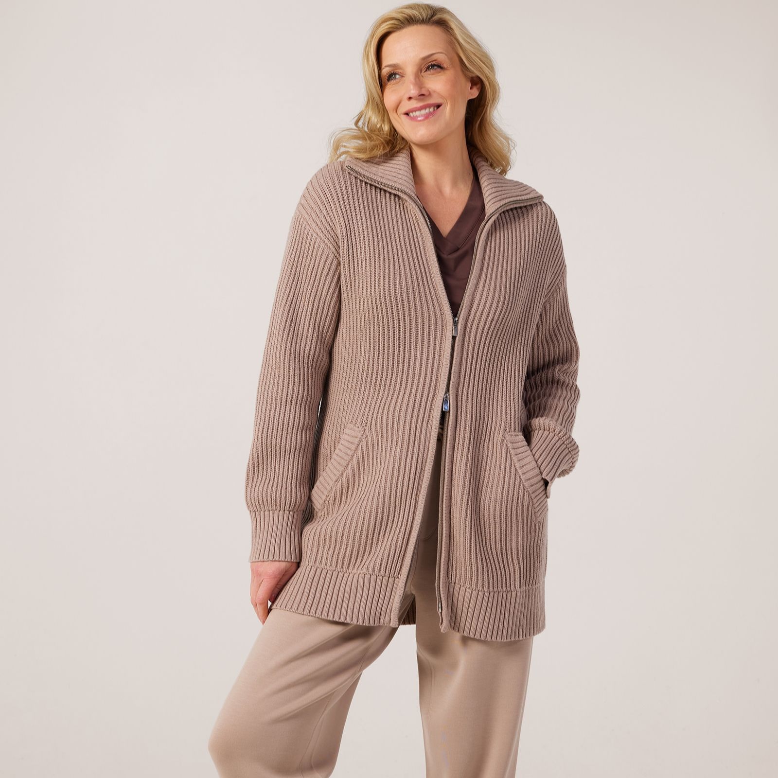 Add a touch of modern flair to your wardrobe with the Ruth Langsford zip through long cardigan, where the sleek zip front and elongated silhouette make layering both stylish and effortless. Ideal for everything from weekend brunches to smart-casual occasions, this versatile piece transitions seamlessly through your day. For a chic look, layer it over tailored trousers and a crisp shirt or style with jeans for relaxed elegance.