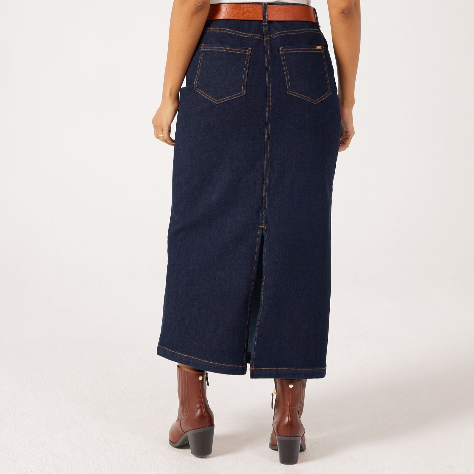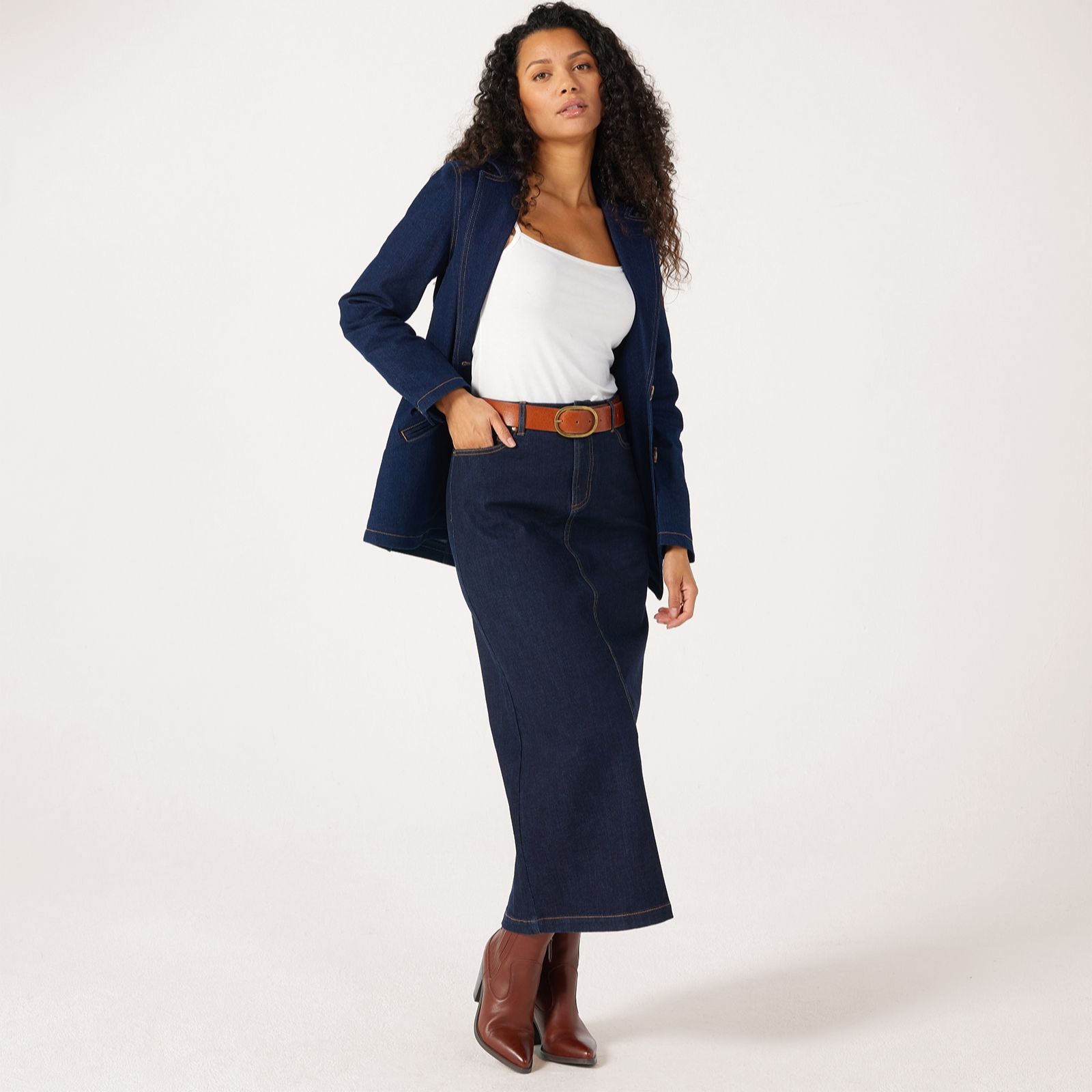 Embrace effortless sophistication with this maxi denim skirt from Ruth Langsford, complete with classic five-pocket styling and a contemporary full-length silhouette. Whether you're heading to brunch, exploring the city or dressing for the office, this skirt offers endless styling potential for any occasion. Try teaming it with a tucked-in blouse and ankle boots for an easy, polished look.
