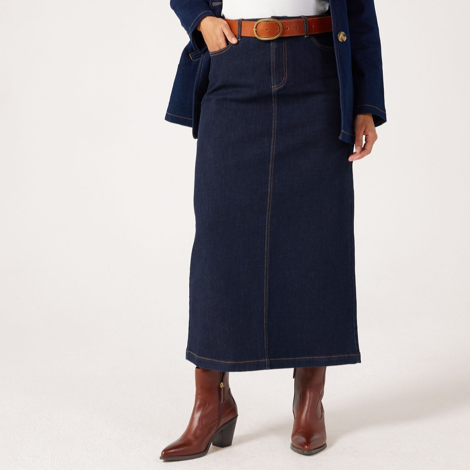 Embrace effortless sophistication with this maxi denim skirt from Ruth Langsford, complete with classic five-pocket styling and a contemporary full-length silhouette. Whether you're heading to brunch, exploring the city or dressing for the office, this skirt offers endless styling potential for any occasion. Try teaming it with a tucked-in blouse and ankle boots for an easy, polished look.