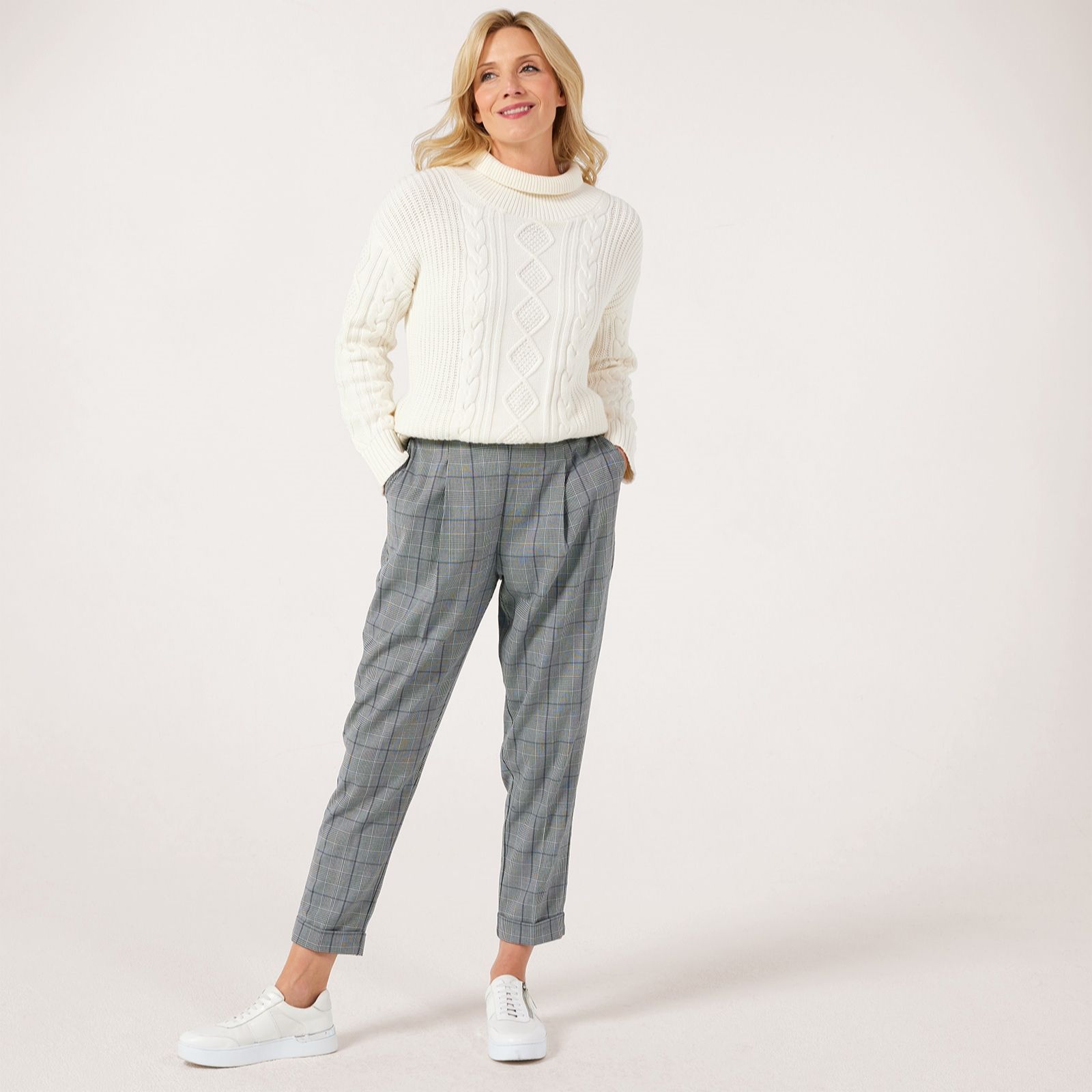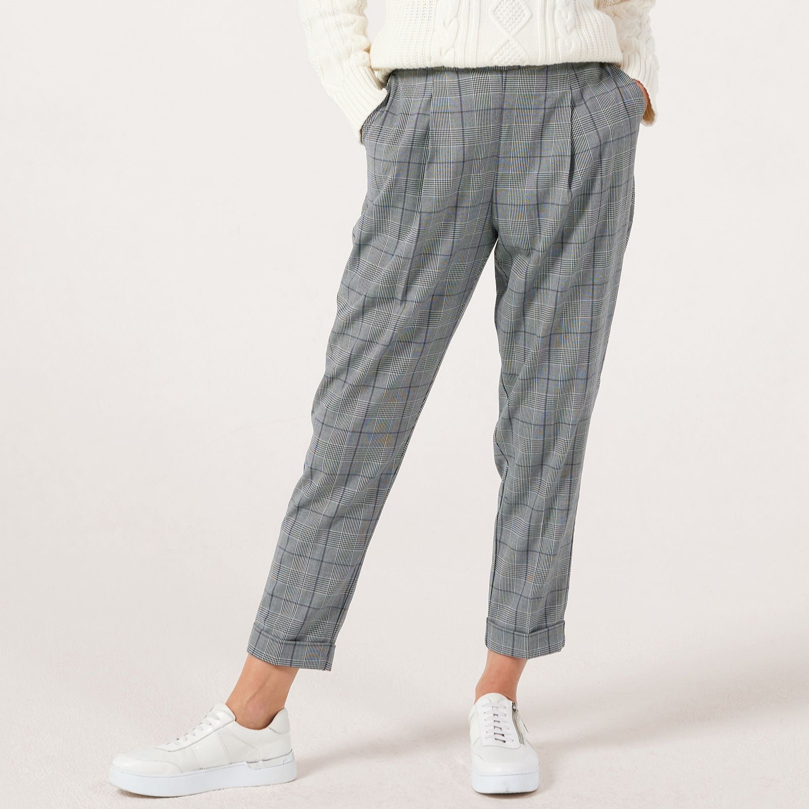 'Check' out the puppy tooth tapered petite trousers from Ruth Langsford, designed to bring a touch of classic charm to your wardrobe with their woven finish and elegant full-length silhouette. The elasticated waistband ensures all-day comfort, making these trousers a smart choice for both work and weekend outings. Try pairing them with a crisp long-sleeve tee and loafers for effortless sophistication.