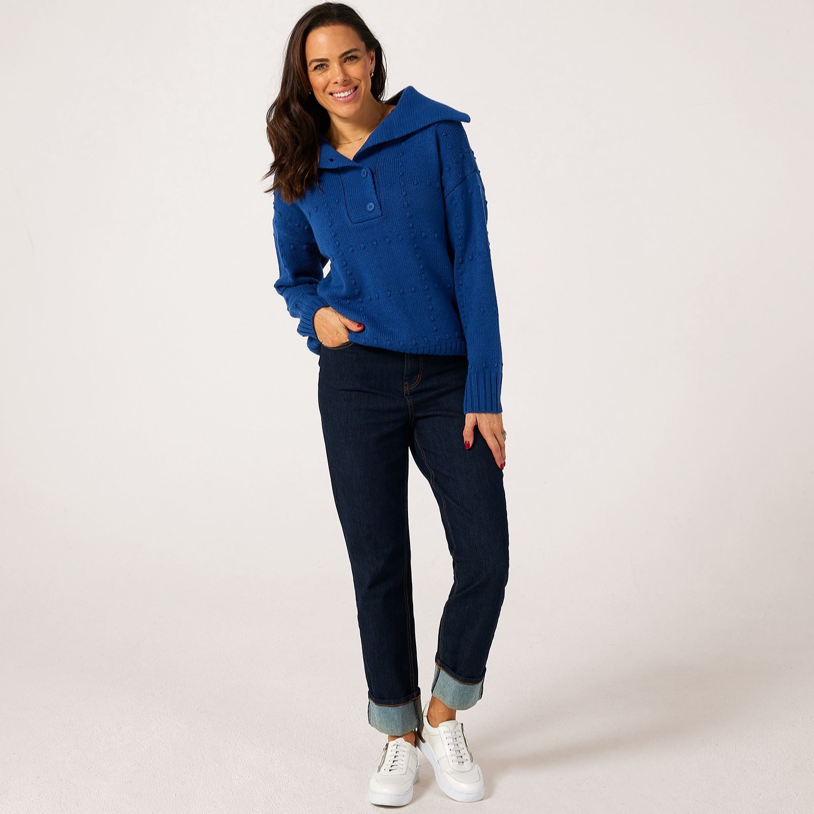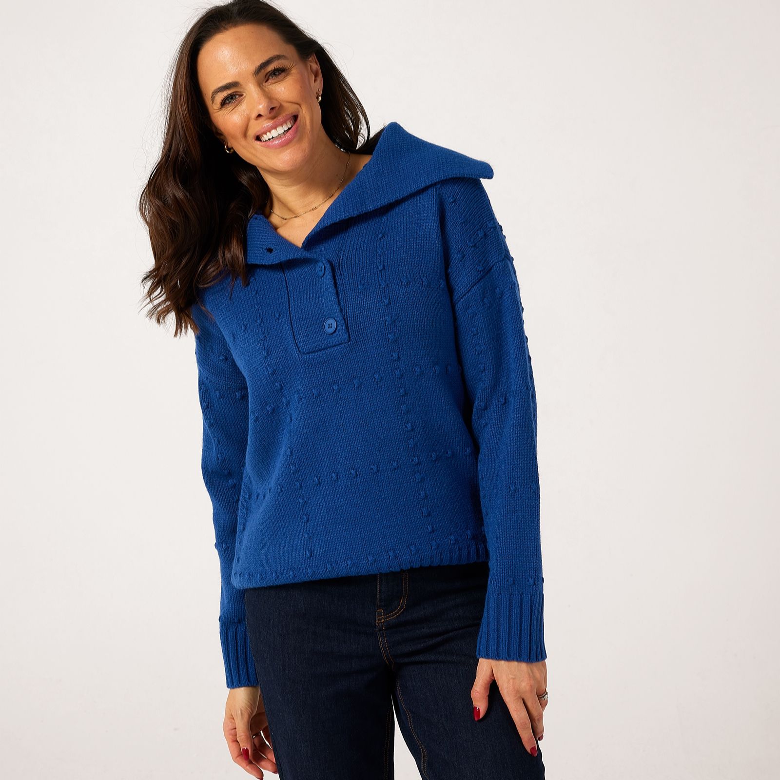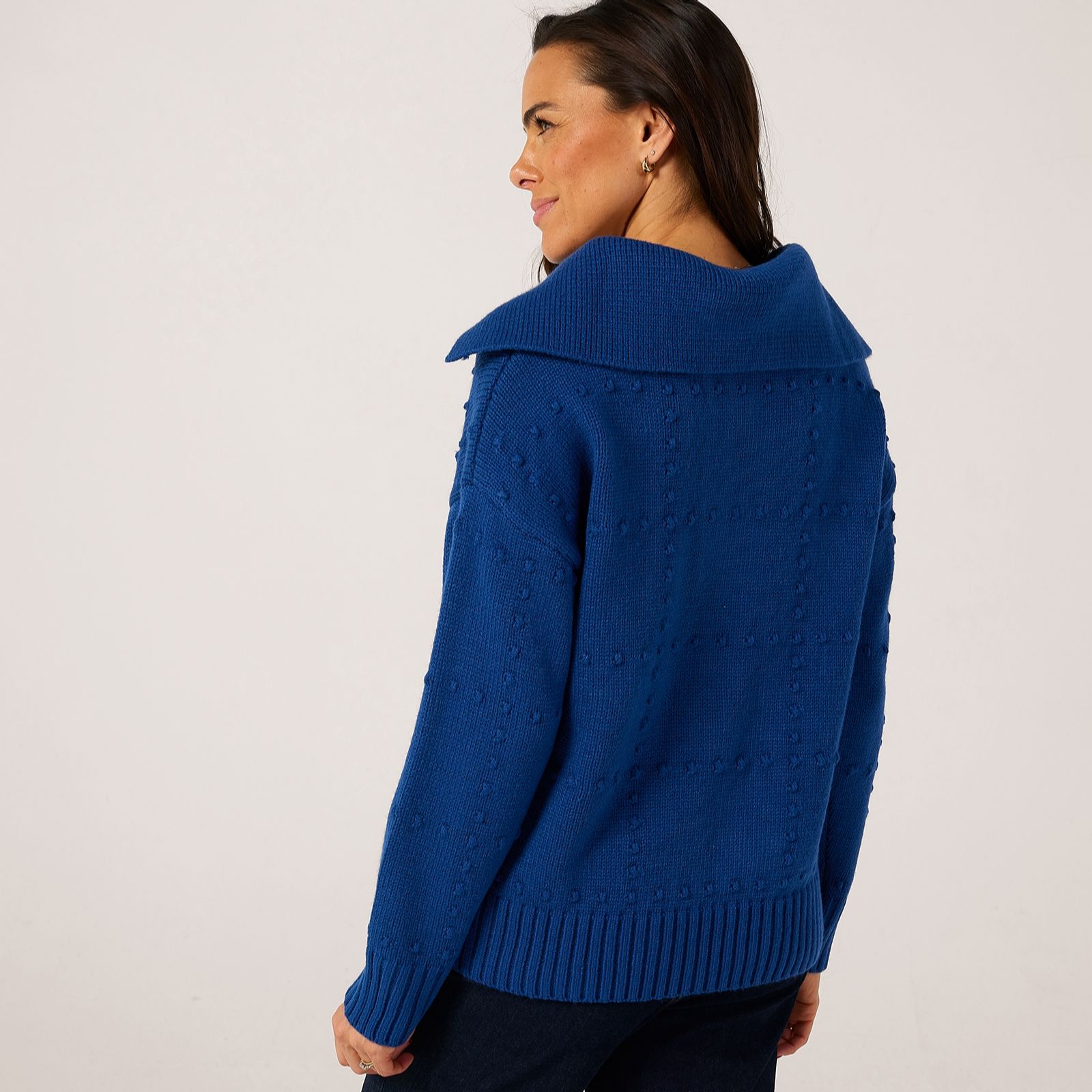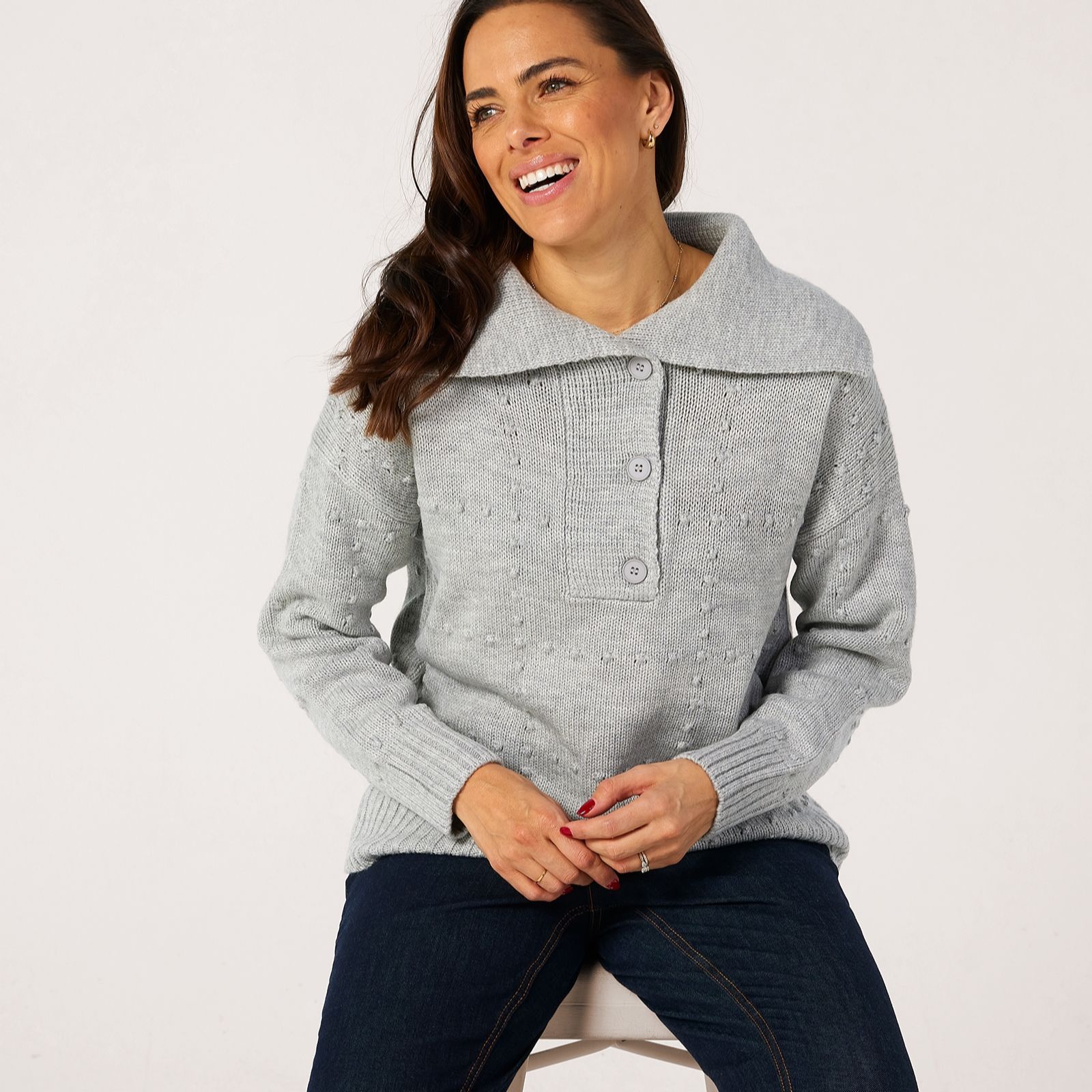 Wrap yourself in effortless style with the Ruth Langsford shawl collar bobble stitch jumper, a cosy knit that brings subtle texture and a contemporary grid design to your everyday wardrobe. Whether you're heading out for brunch or enjoying a relaxed evening at home, its chic silhouette ensures comfort and sophistication. Pair it with tailored trousers or your favourite jeans for a polished yet laid-back look.
