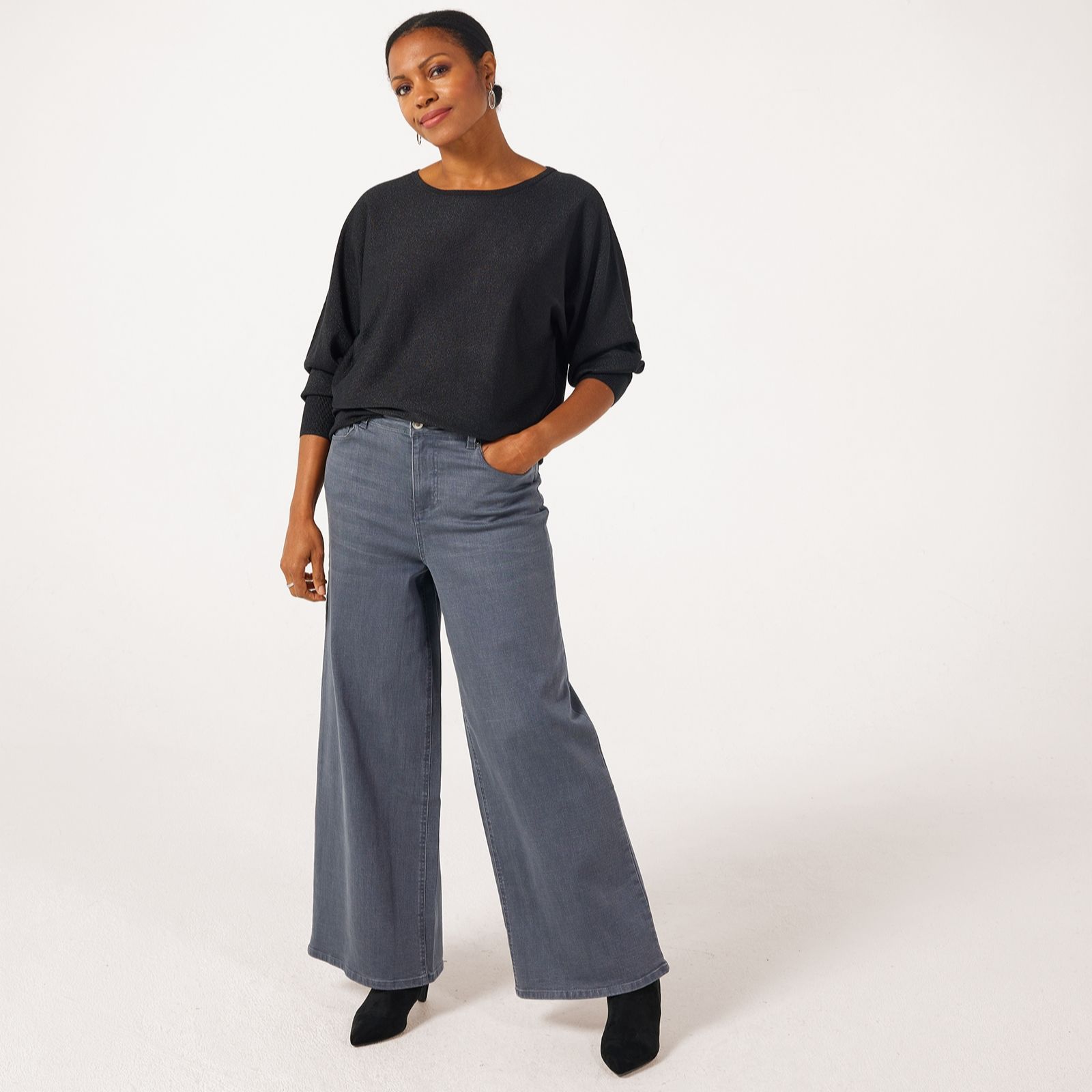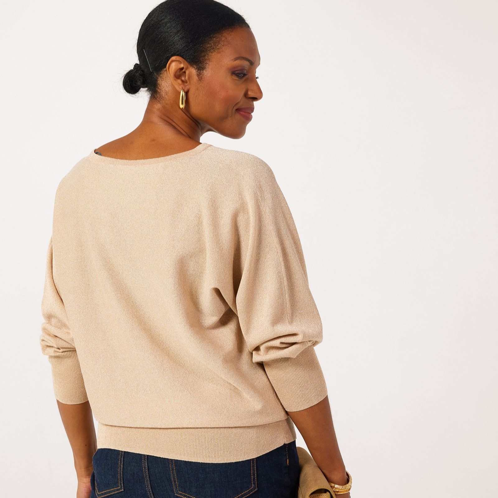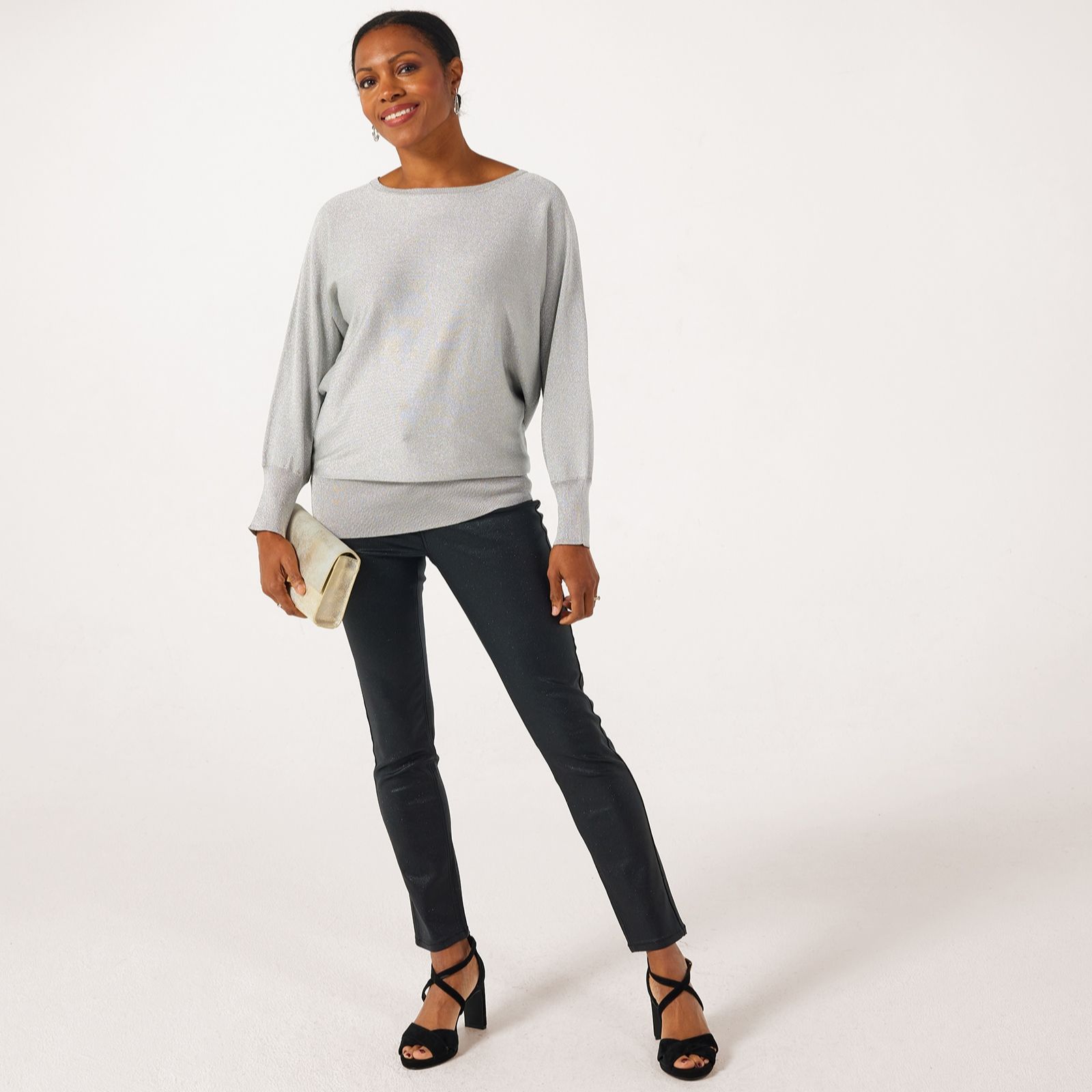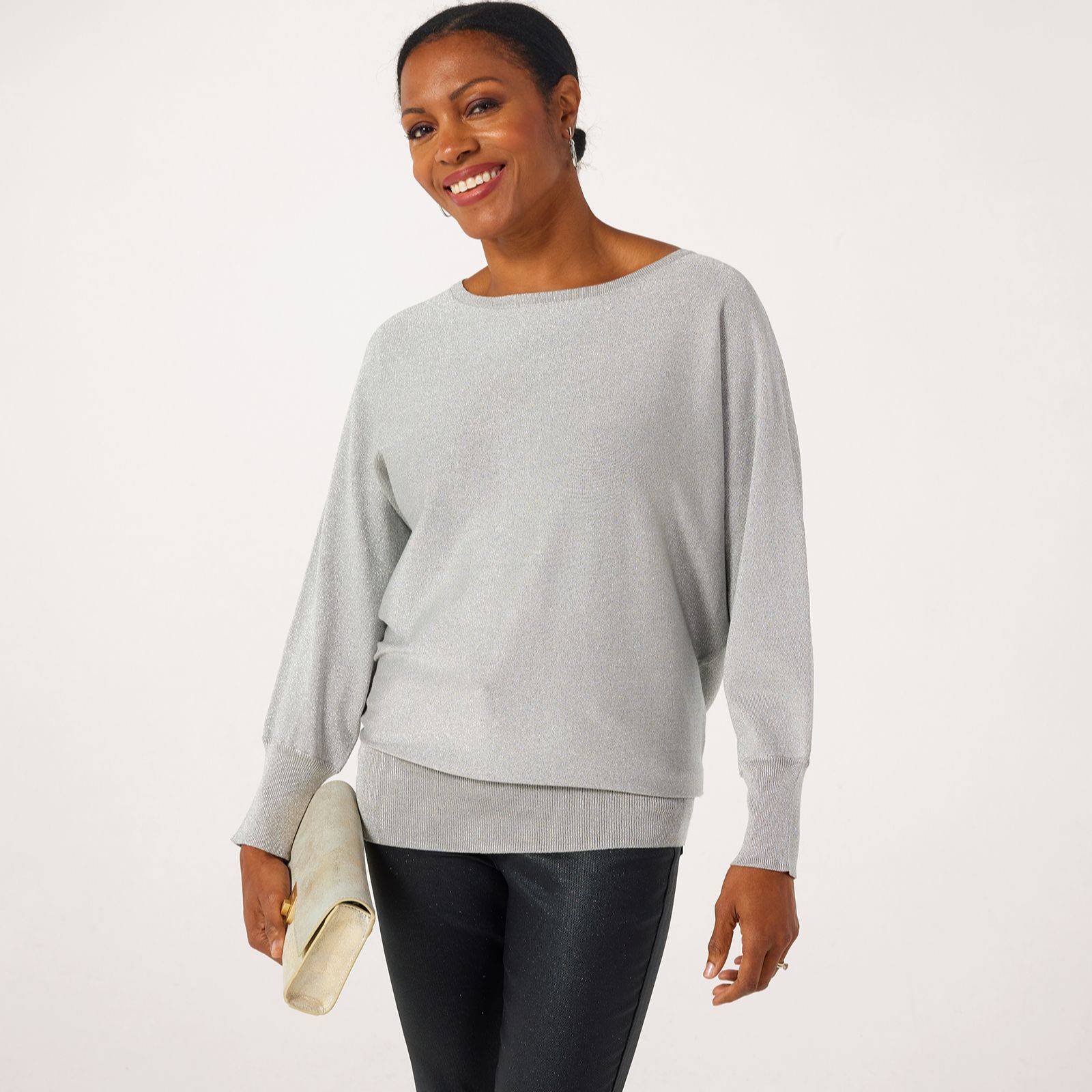 Shine bright in the Ruth Langsford shimmer batwing jumper, where the eye-catching Lurex detail and relaxed batwing sleeves bring a touch of glamour to everyday dressing. Whether you're heading to dinner, a weekend brunch or simply want to add sparkle to your workwear, this jumper is a versatile choice for any occasion. Try pairing it with tailored trousers or your favourite jeans for an effortlessly chic ensemble.