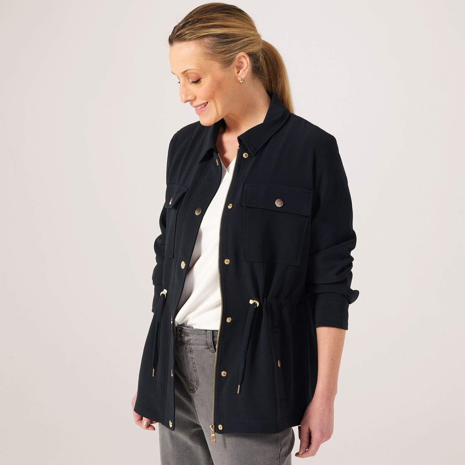Embrace the perfect blend of style and functionality with the Ruth Langsford Utility Jacket. Its semi-fitted design flatters the silhouette, gently hugging the bust and waist before flaring out for a touch of elegance. Crafted from a blend of polyester and elastane, this jacket promises both comfort and durability, making it an ideal choice for the dynamic woman on the go.