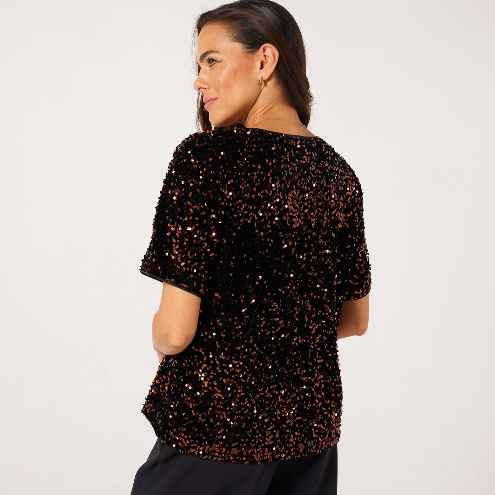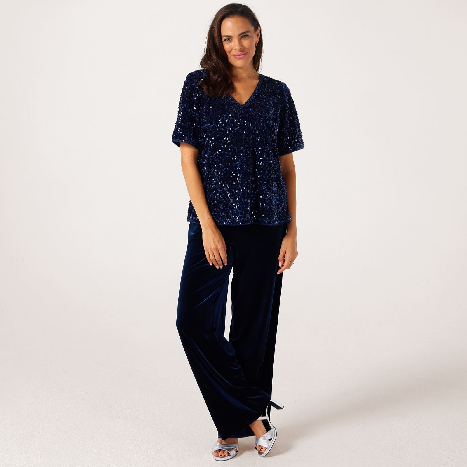 Make this your season of sparkle with this glamorous velvet sequin top from Ruth Langsford! Showcasing a glittering sequinned velvet fabric and a flattering V-neckline, this top is the perfect accompaniment to your smart skirts and trousers. Dress it up with heels for party season or wear it with your favourite jeans for a relaxed night out whatever the occasion, it's just the thing to let yourself shine!