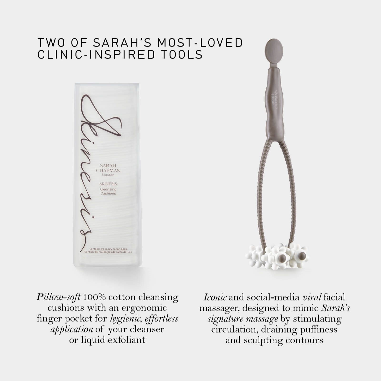 Bring a touch of Sarah Chapmans clinic expertise to your daily ritual with the Facialift and Cleansing Cushions set, combining her iconic massage-inspired tool with ultra-soft, 100% cotton pads for a spa-like experience at home. Whether youre starting or ending your day, this duo helps to enhance your cleansing routine and support the look of refreshed, healthy-looking skin.