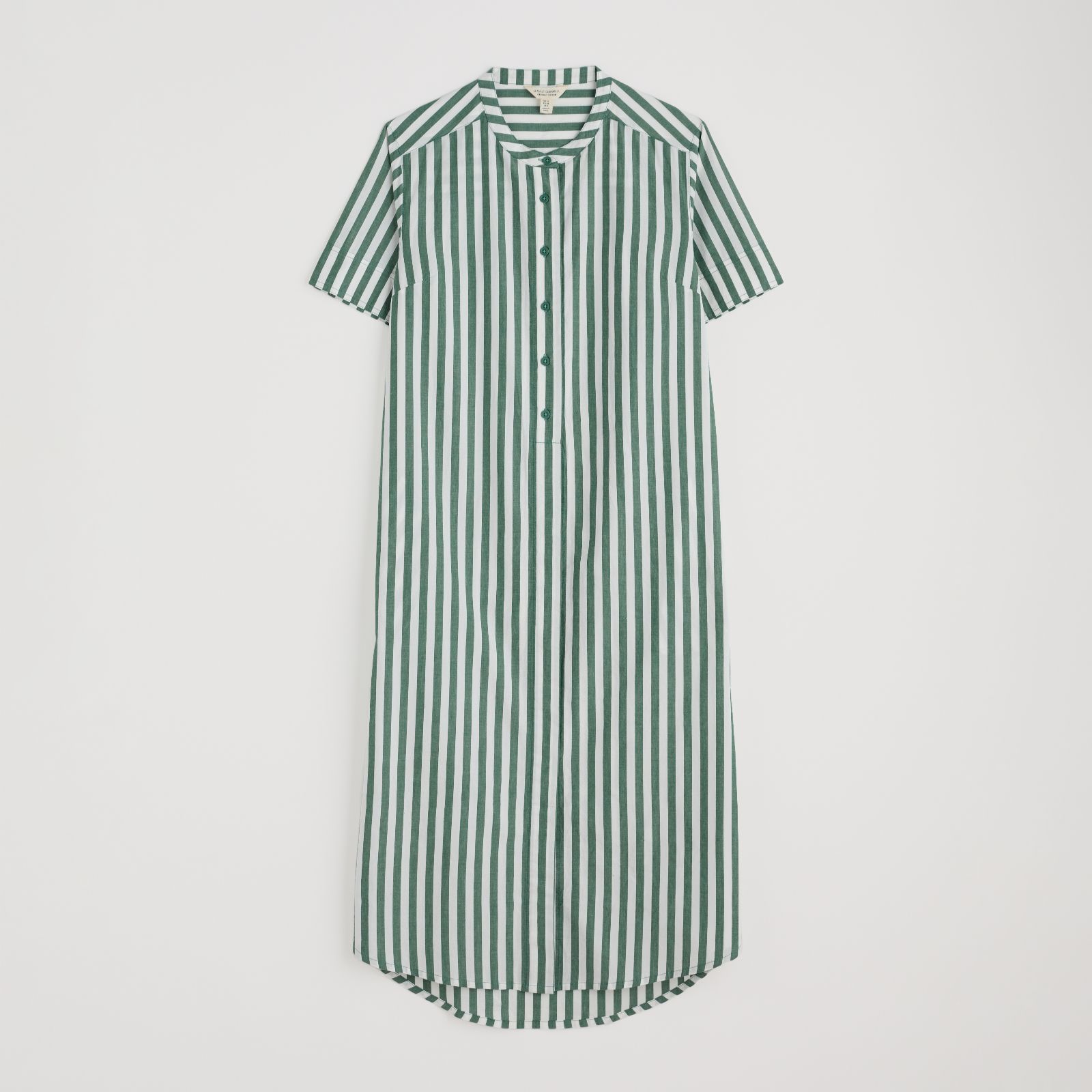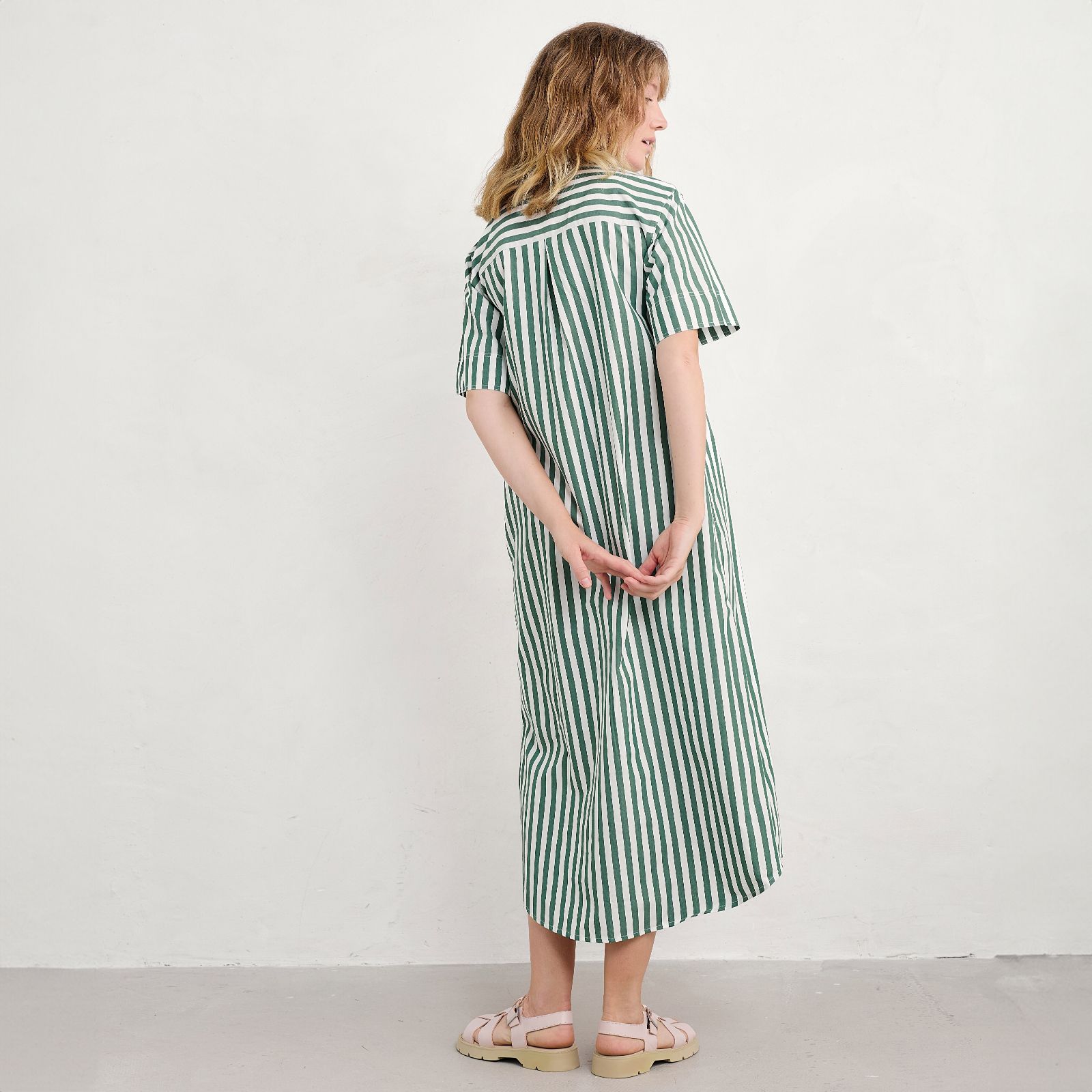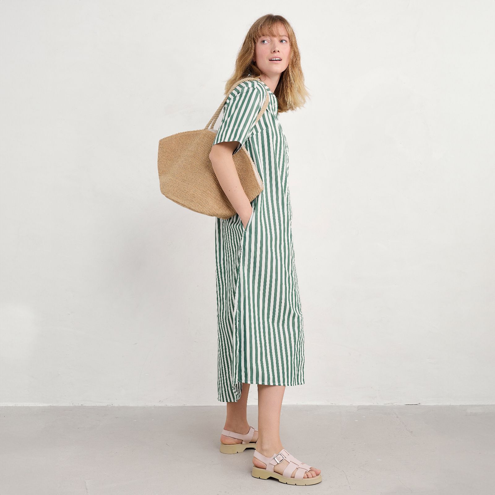 Embrace effortless charm with the Harbour Movement Dress from Seasalt Cornwall, a delightful midi shirt dress adorned with seaside stripes. Crafted from soft organic cotton, this dress features a relaxed fit that gently flares towards a curved high-low hem, ensuring comfort and style. The grandad collar and half button placket add classic touches, while the half-length sleeves and in-seam pockets provide practicality. Perfect for casual days out or seaside strolls, pair it with your favourite sandals for an easy, breezy look.