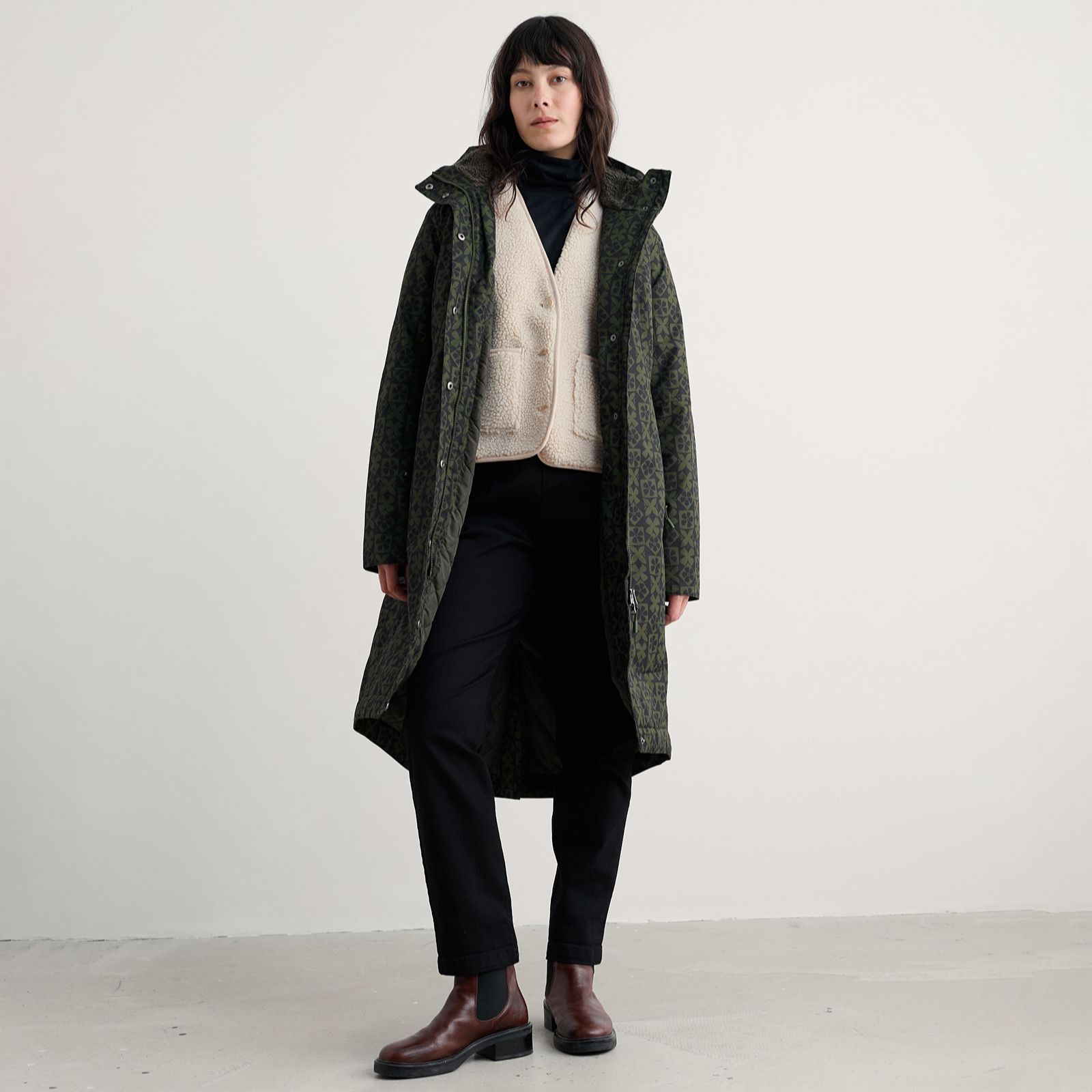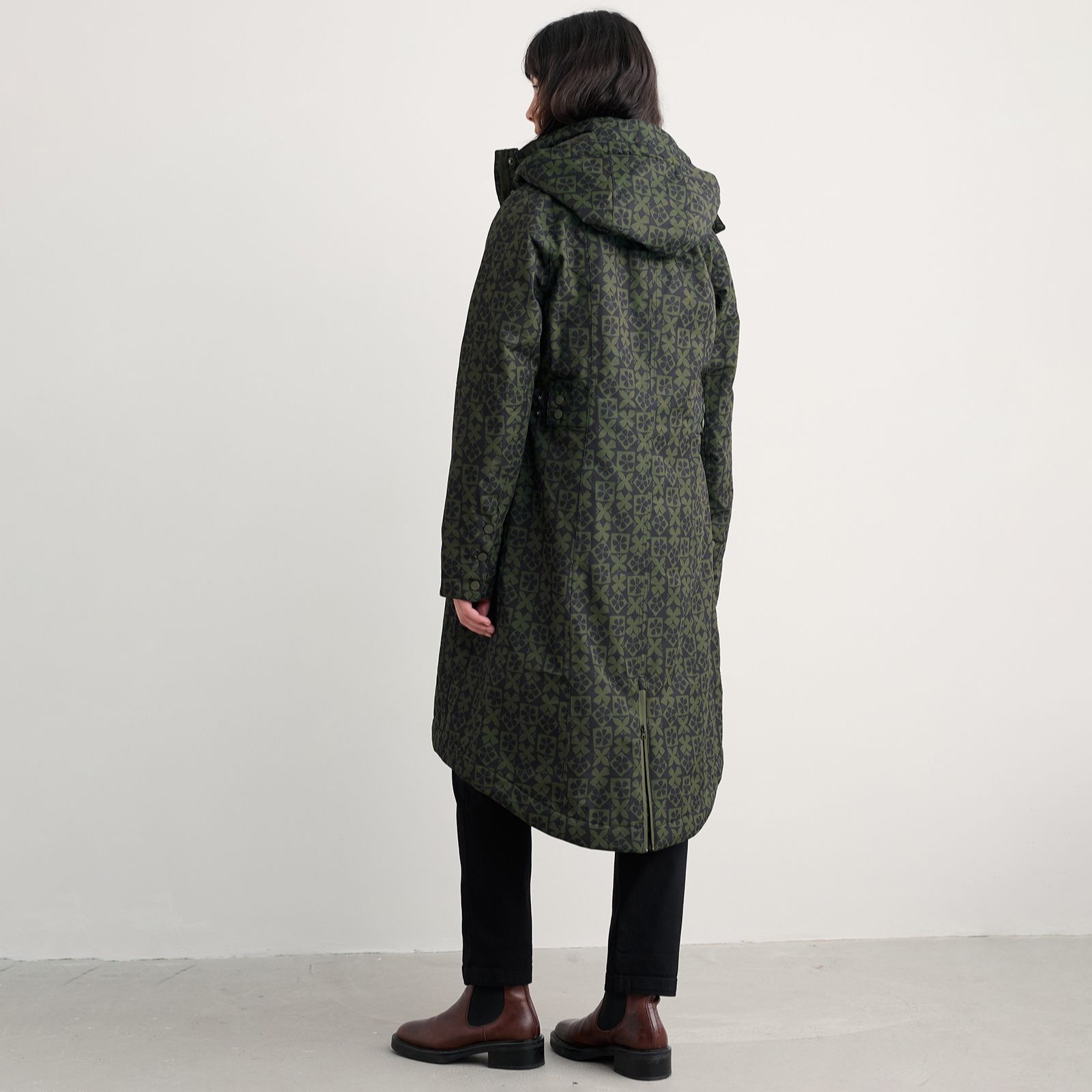 Stand up to the elements in the Seasalt Cornwall Janelle print coat, a knee-length raincoat designed for both style and practicality. Its relaxed fit and thoughtful detailing, including a detachable peaked hood and reflective strips, make it ideal for blustery commutes, countryside walks or city adventures. Pair it with chunky boots and a cosy scarf for a look that's as fashionable as it is functional.