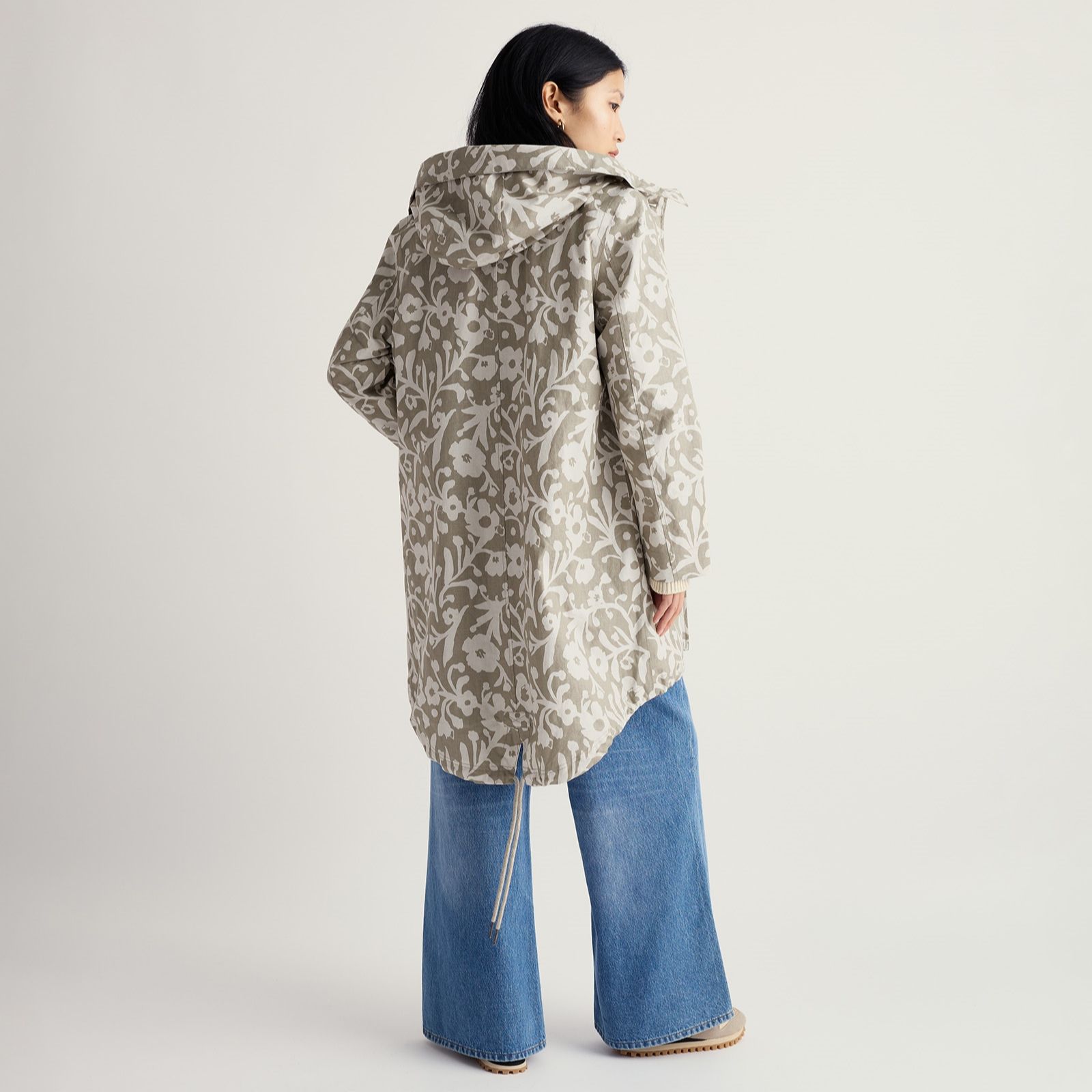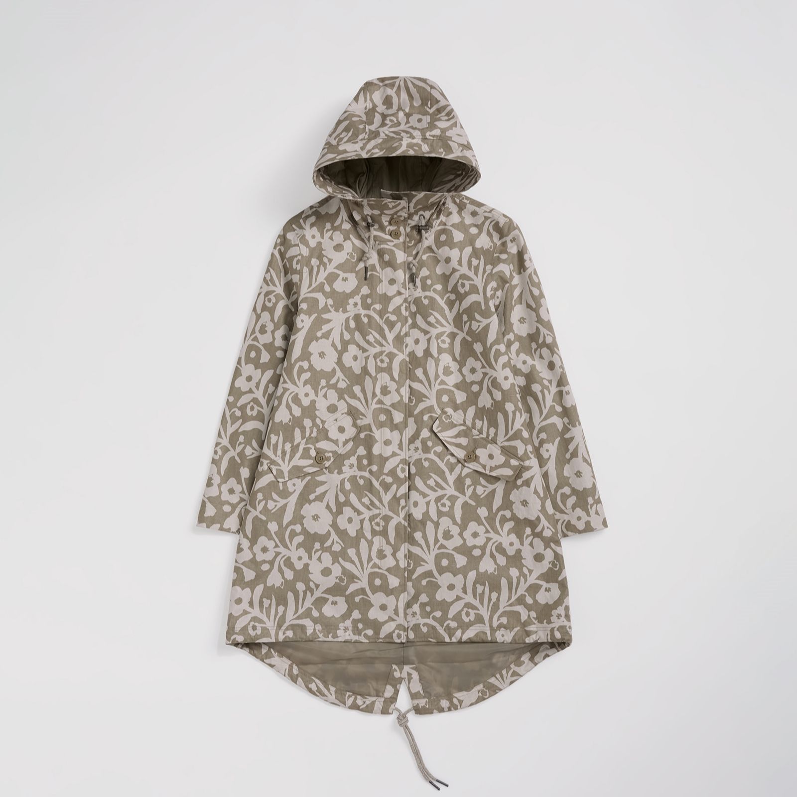 - Adjustable, non-detachable hood and adjustable fishtail hem