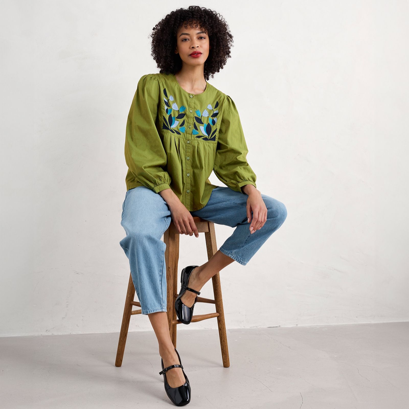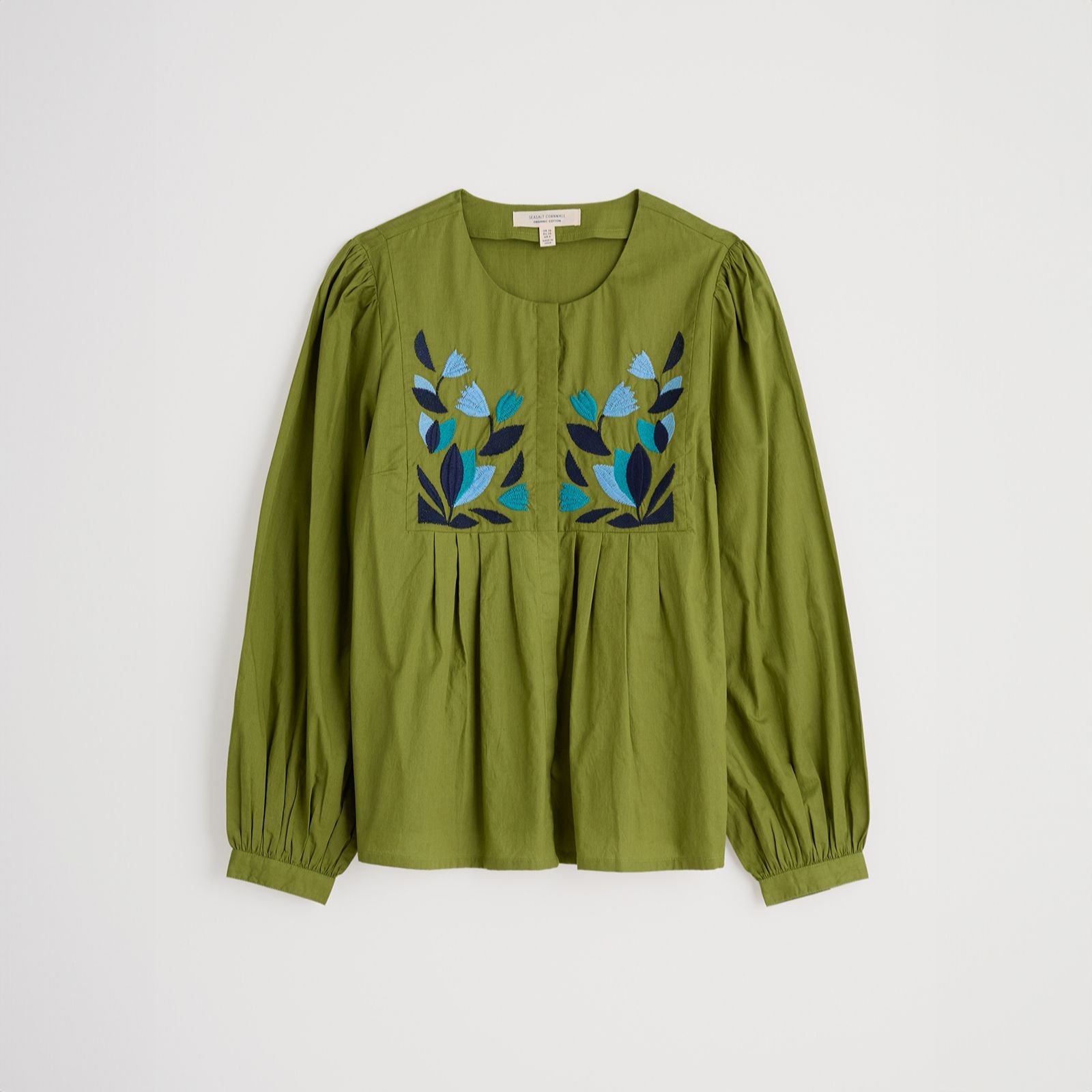 The Seasalt Cornwall Thornapple embroidered shirt is a charming wardrobe addition, featuring a handcrafted print and bib yoke with gathers for an easy, loose shape. The blouson sleeves with button cuffs add elegance and versatility, perfect for tucking in or wearing loose. Ideal for layering under knitted vests, this shirt transitions effortlessly from casual outings to polished occasions. Pair it with tailored trousers or jeans for a chic, laid-back look.