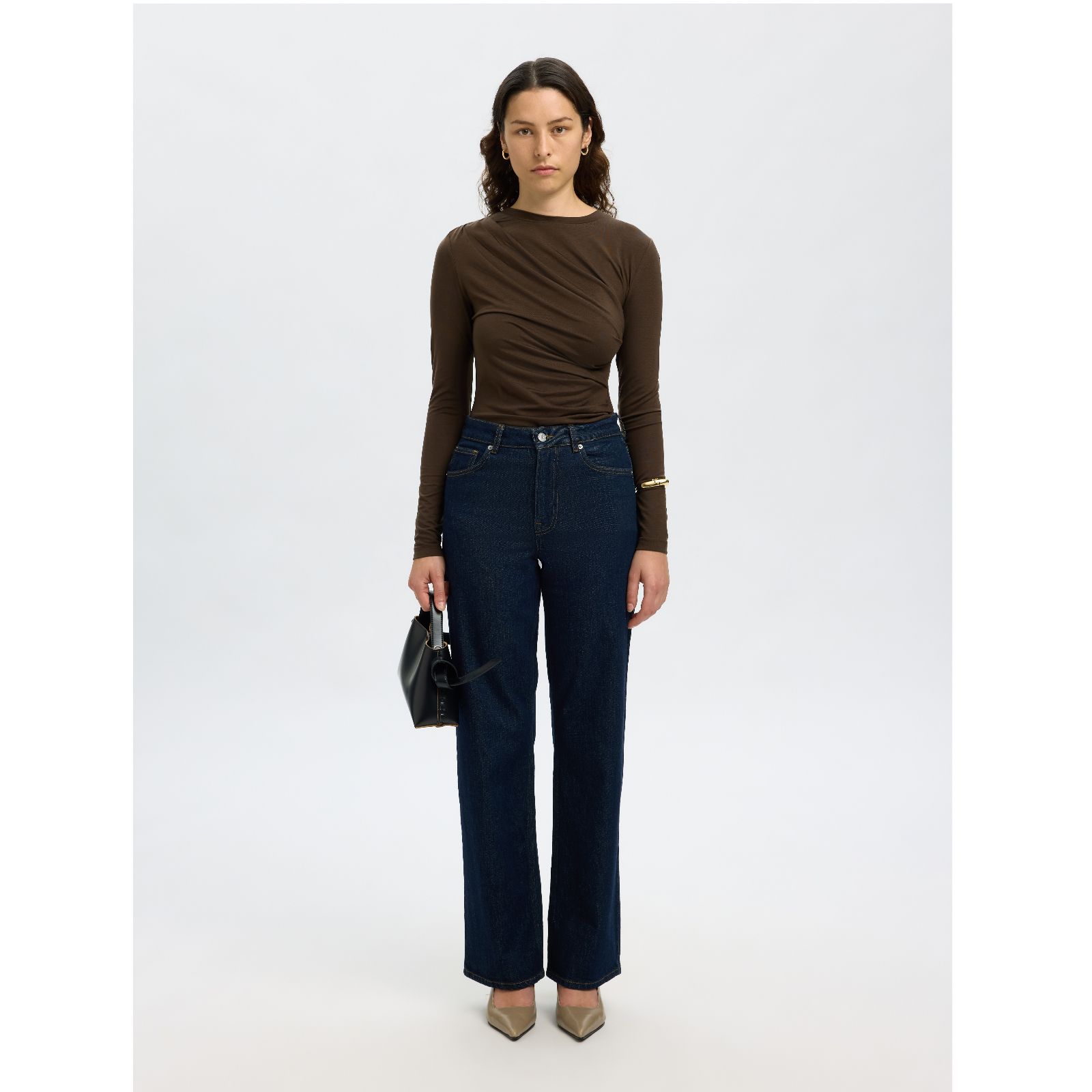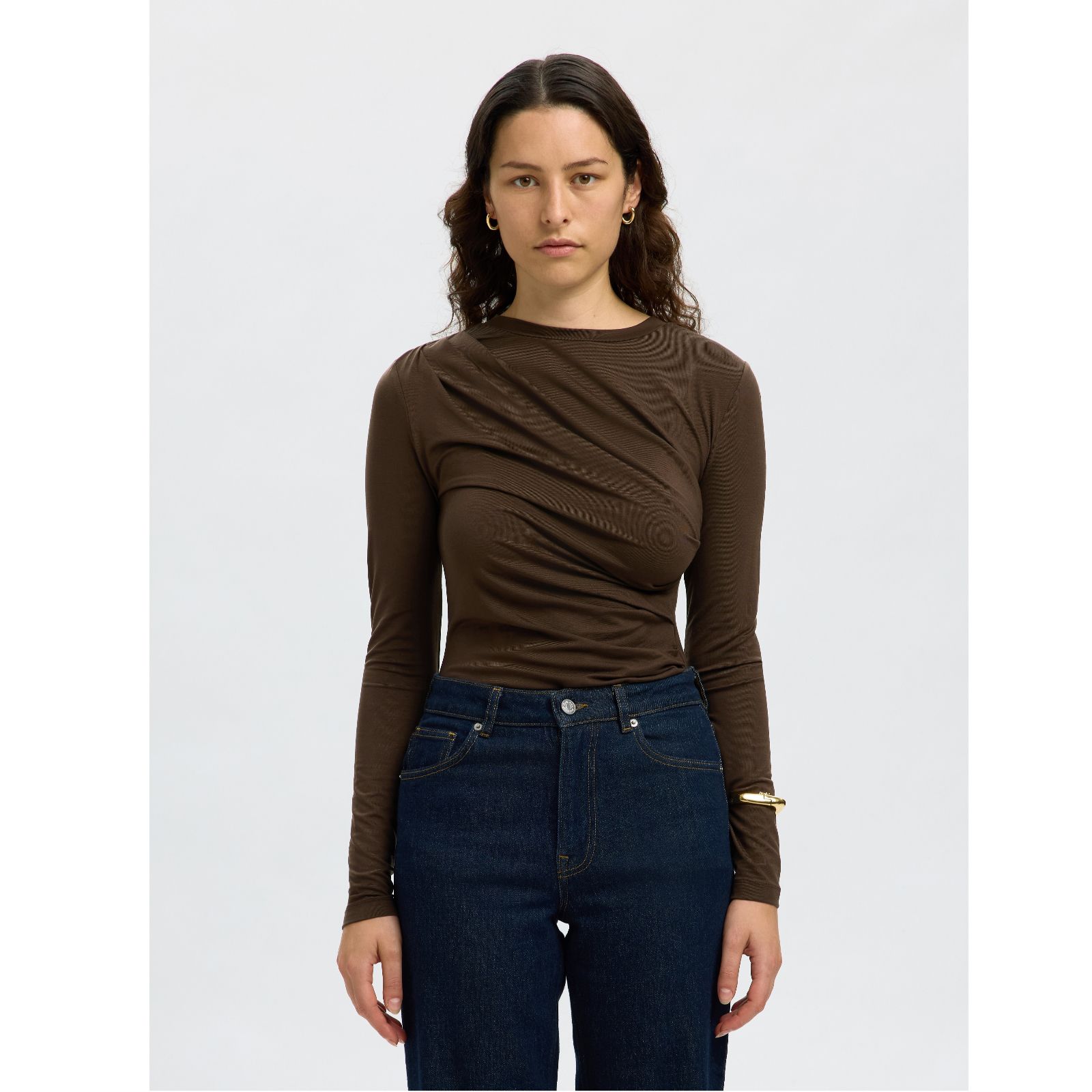 Set the style for your everyday look with the Ilina ruched top from Selected Femme, a trendy piece designed with subtle ruching across its regular fit silhouette. The classic round neck and long sleeves make it a glamorous choice for everything from spontaneous weekend plans to a smart-casual office day. Pair it with tailored trousers for a polished feel or team it with jeans for effortless off-duty style.