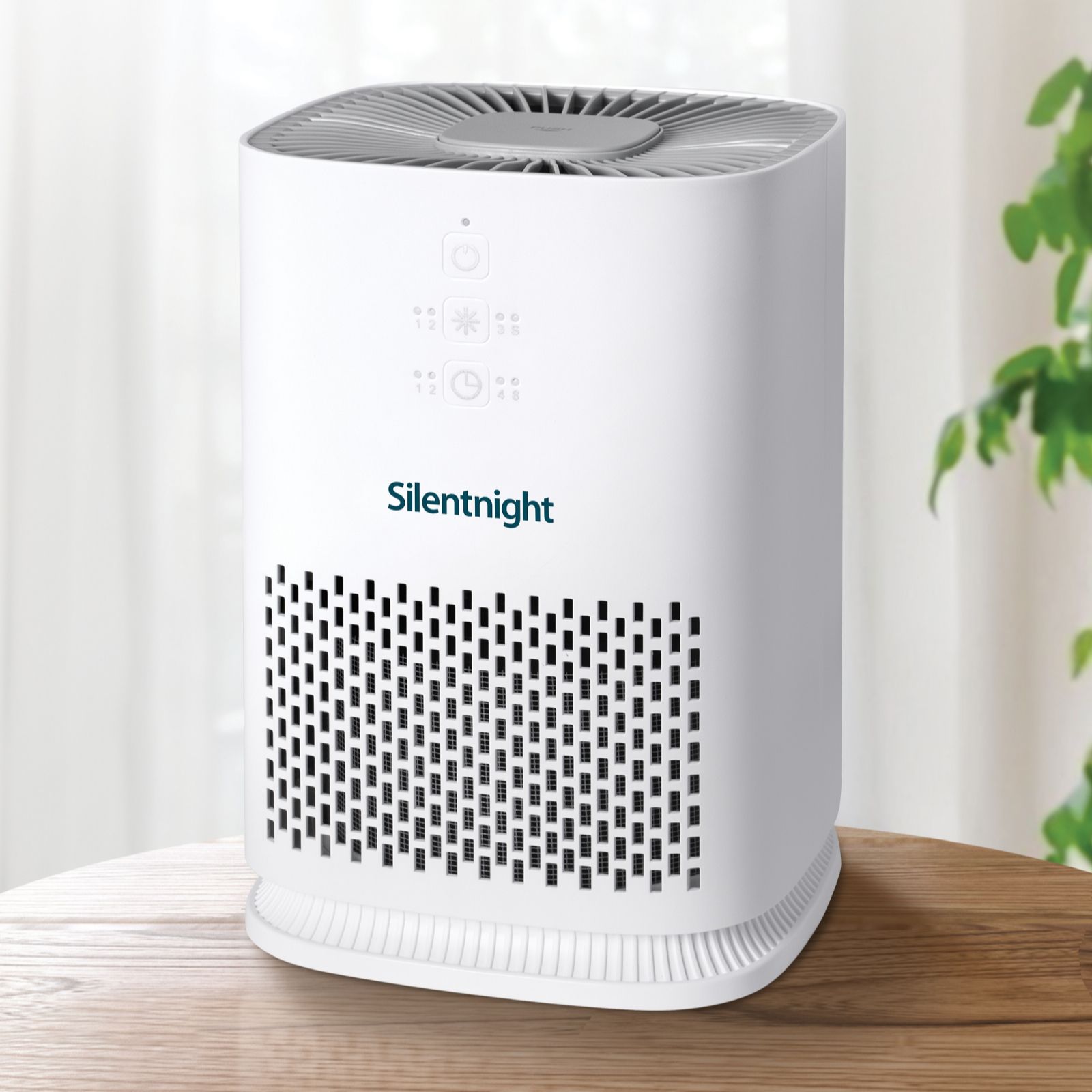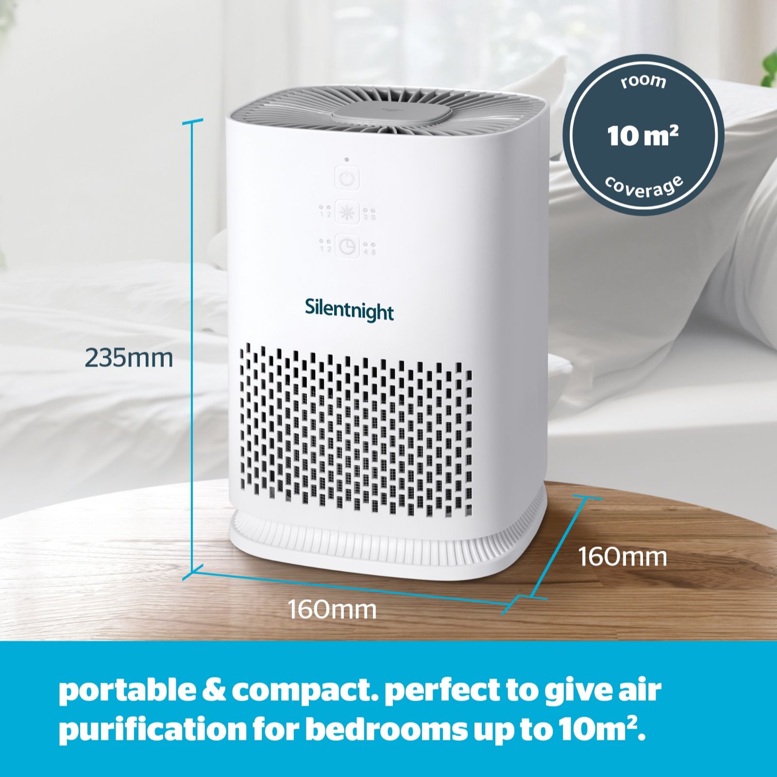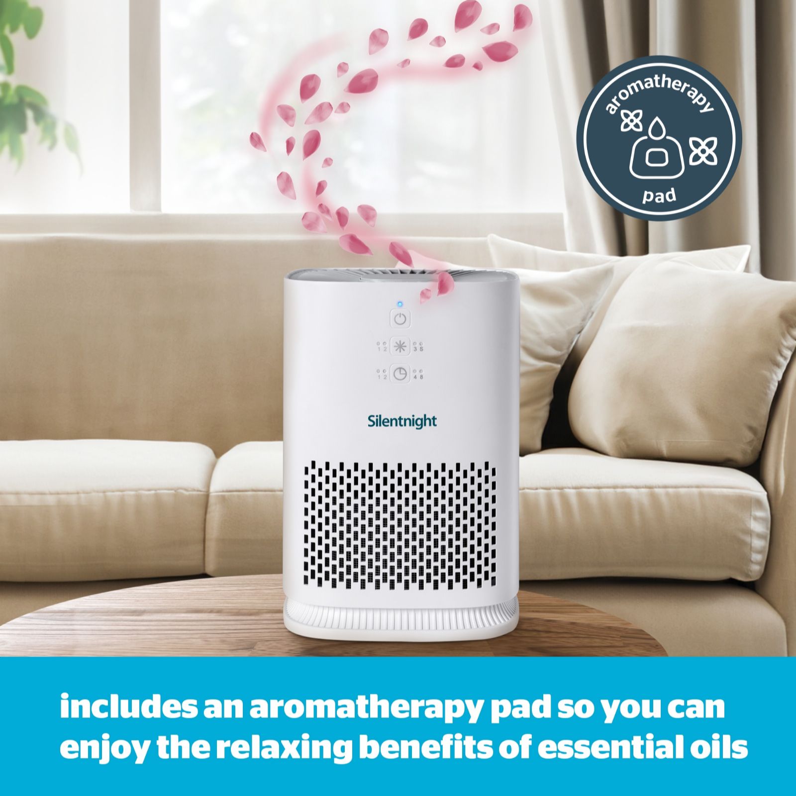 Experience fresher air and a refreshing night's sleep with the Silentnight Airmax 800 Air Purifier. This innovative purifier features a true 3 stage HEPA filter, working to remove dust, smoke, pollen, and allergen airborne particles, ensuring a soothing, peaceful environment. The whisper quiet sleep mode and aromatherapy pad enhance relaxation, making it perfect for bedrooms.