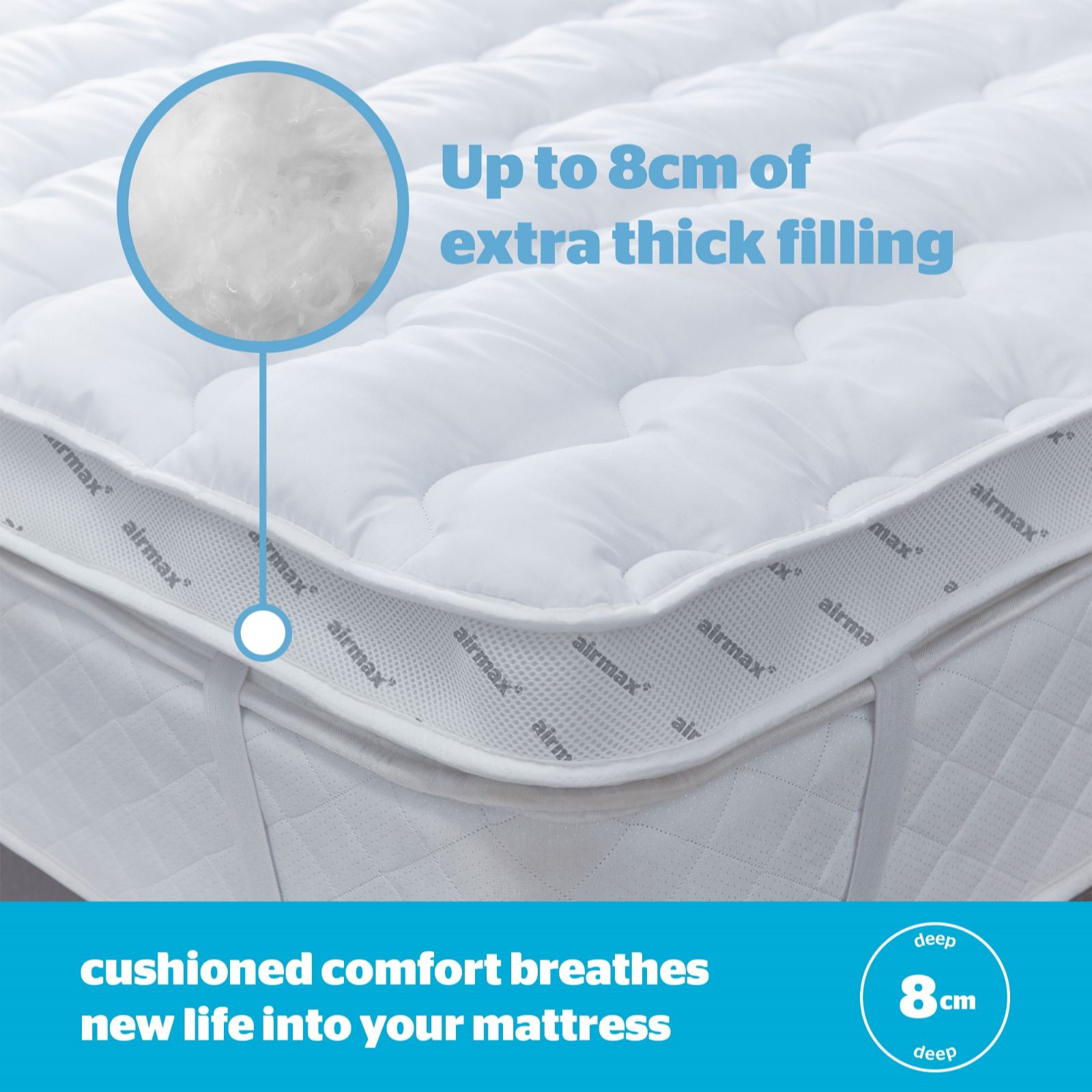Give your mattress an instant upgrade with the Silentnight Airmax 800 Superwash Mattress Topper. Expertly crafted with Airmax technology and a deep 8cm (3.1") fill of Fibadown fibres, this thick topper delivers exceptional breathability and plush cushioning, revitalising your existing mattress and adding an extra layer of comfort to your bed, so that you wake up truly refreshed every morning.