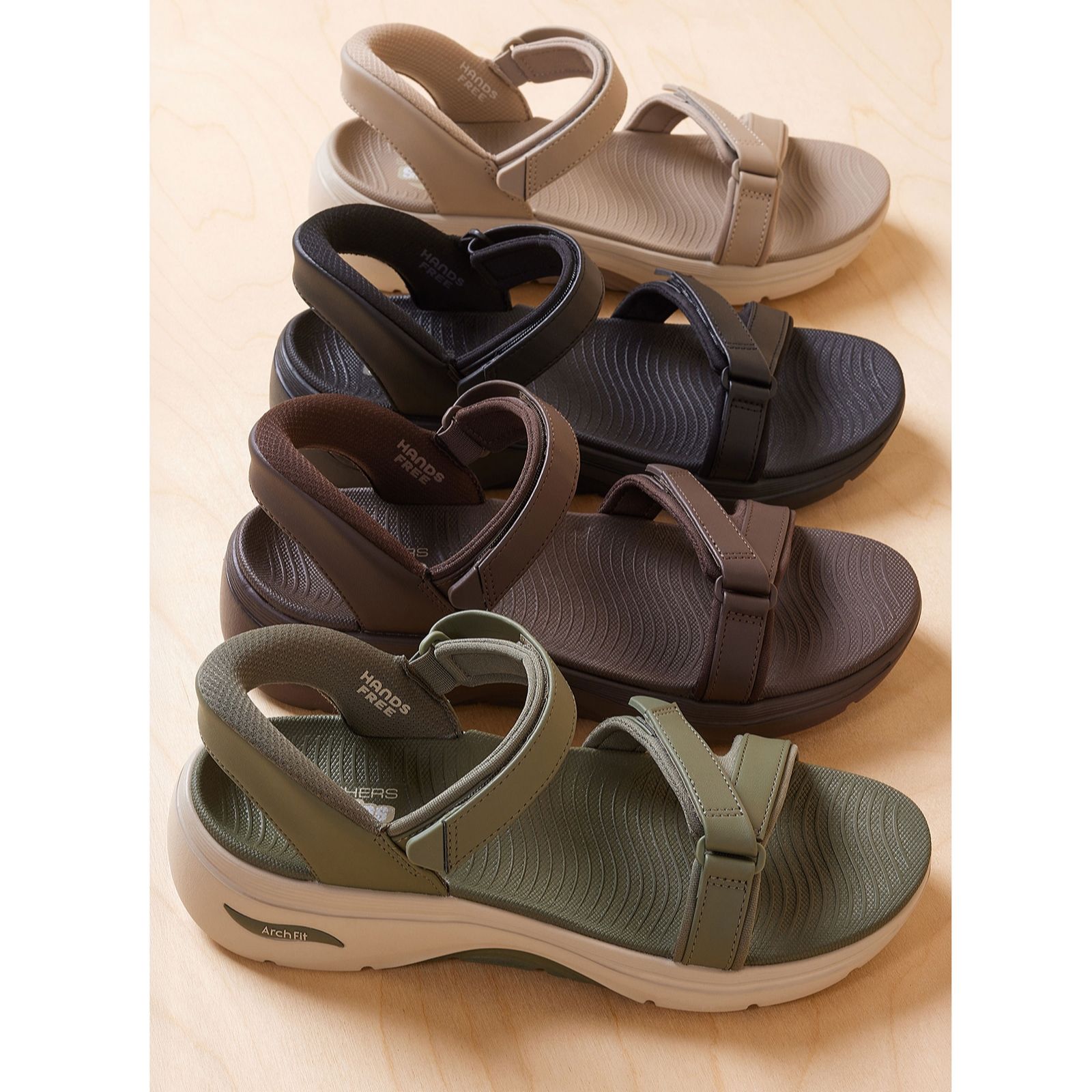 - these sandals combine the supportive feel of Arch Fit with Skechers hands-free Slip-ins and the all-day comfort and cushioning of GoWalk for a supreme feel that keeps you active and energised from morning to night.